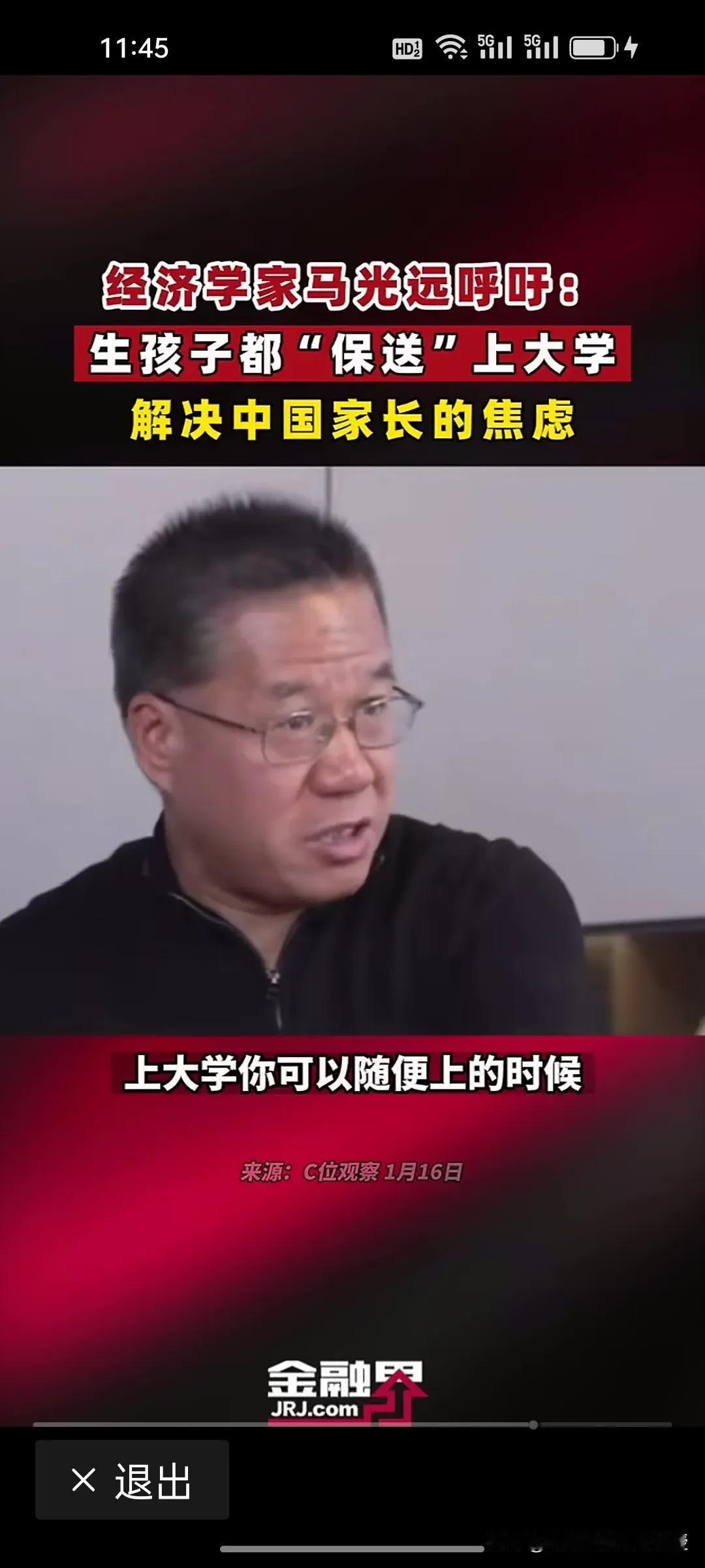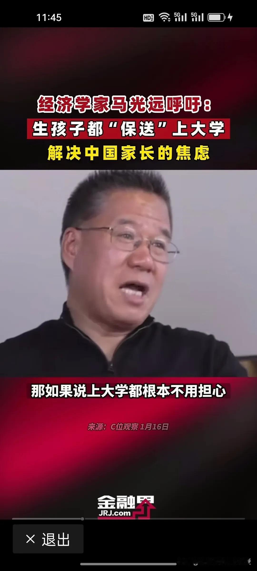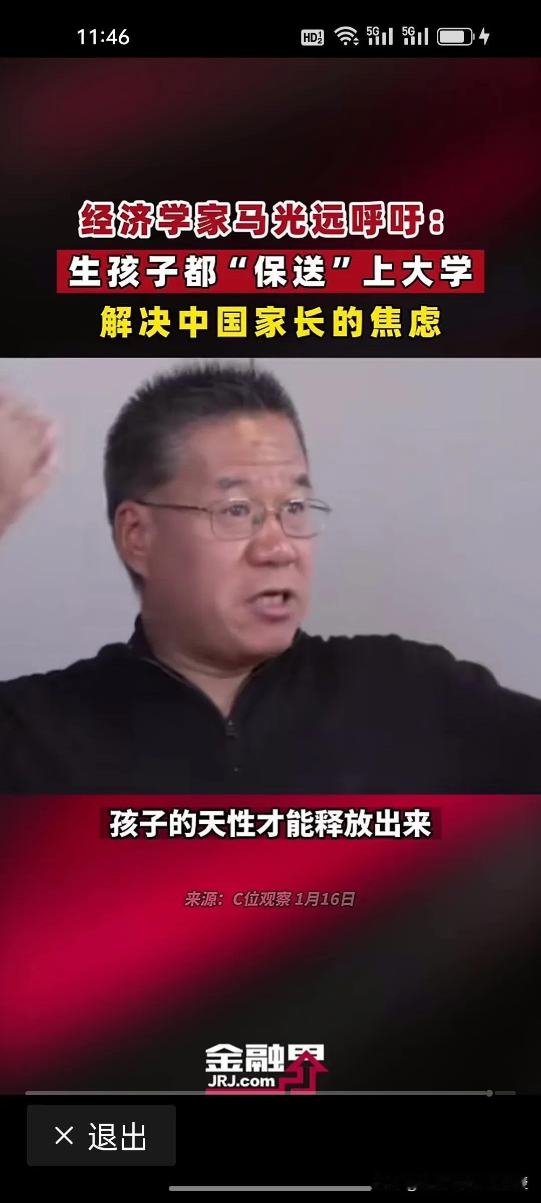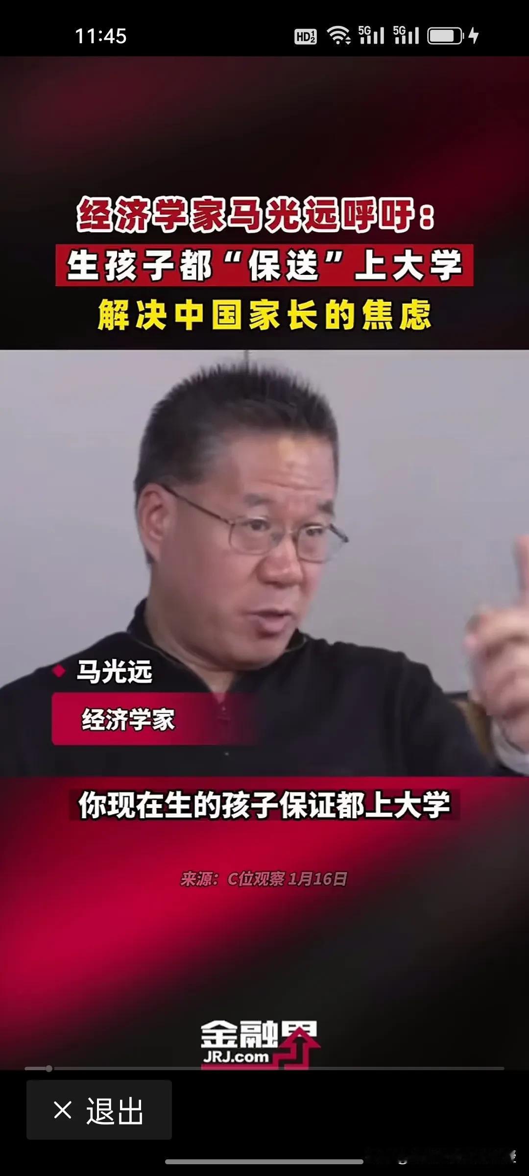 每个孩子都保送大学就能解决中国家庭焦虑? 马光远先生说“生孩子保送大学”就能解决家长焦虑,可是,现在家长的焦虑,从来不是“能不能上大学”,而是“上了大学能不能找到好工作”。如果孩子没有扎实的学习能力和真才实学,就算“保送”进大学,也可能混到毕业就失业。 现在的芯片半导体,人工智能等等行业,哪一个不需要过硬的知识储备呢?保送大学就能解决科技卡脖子问题吗? 高考的核心不是“筛选”,而是给普通家庭的孩子提供一条最公平的上升通道。如果取消选拔、全员保送,不仅会让基础教育彻底躺平,更会让阶层固化愈演愈烈。没有扎实的人才基础,科技突破、产业升级更是无从谈起。 与其空谈“保送”,不如想想怎么让大学教育更贴合就业需求,让每个努力的孩子都能拥有真正的竞争力,找到一份专业对口的好工作。