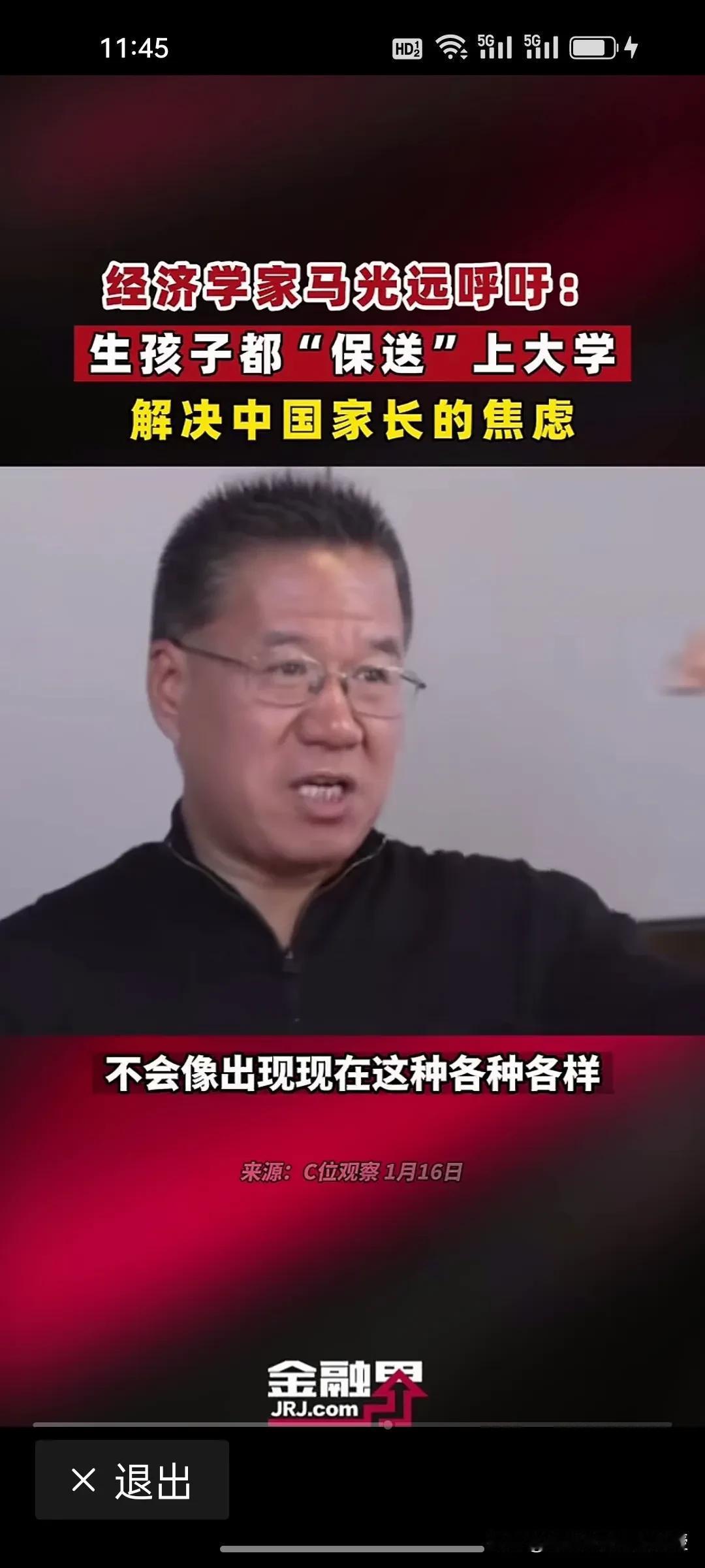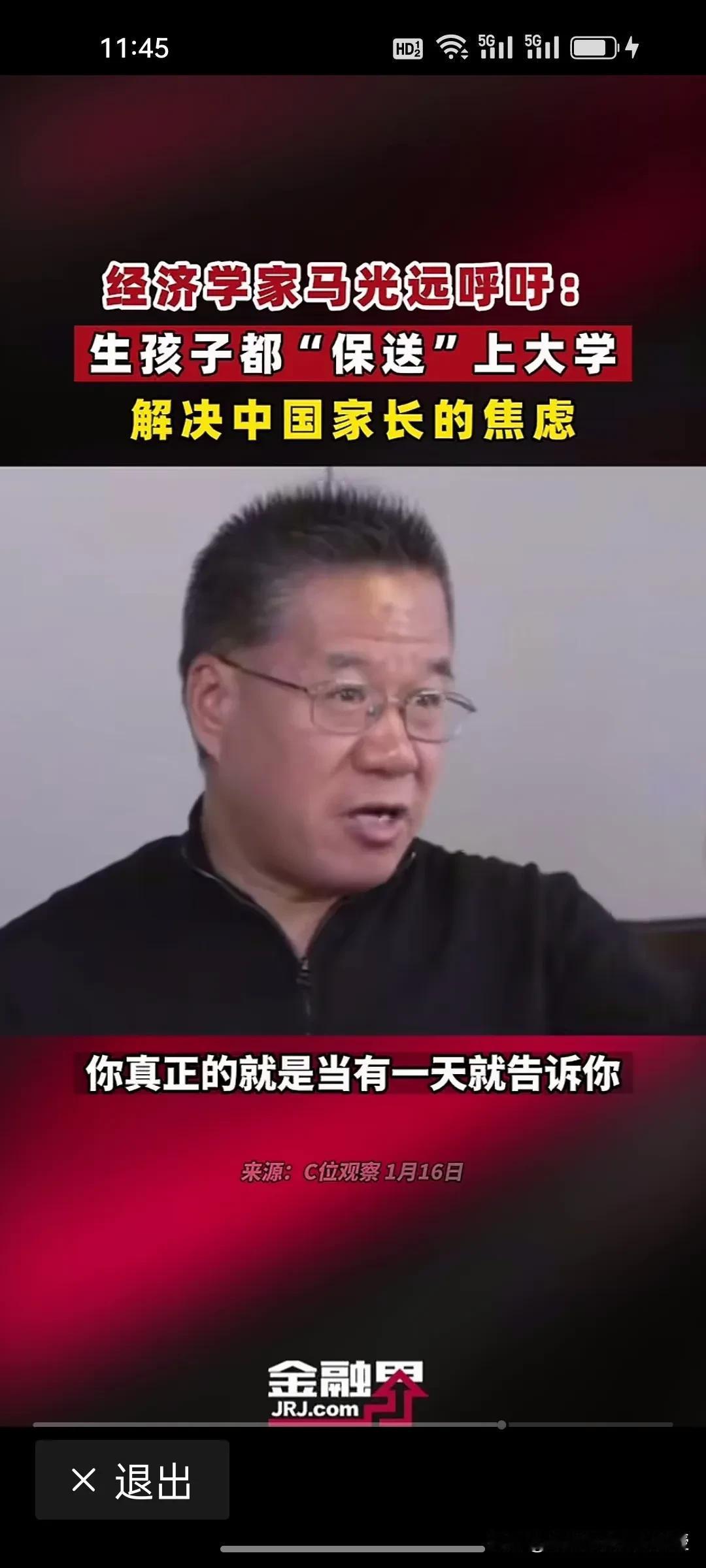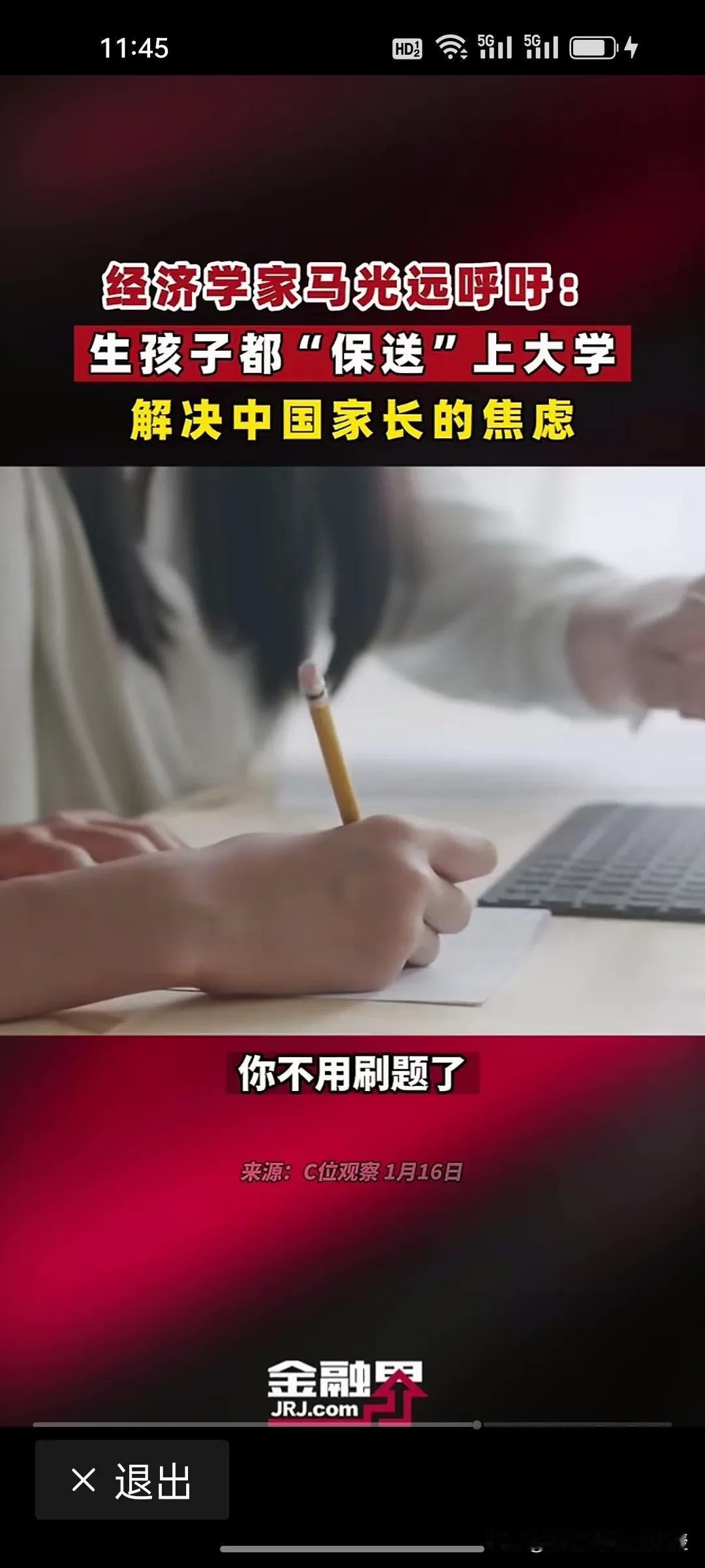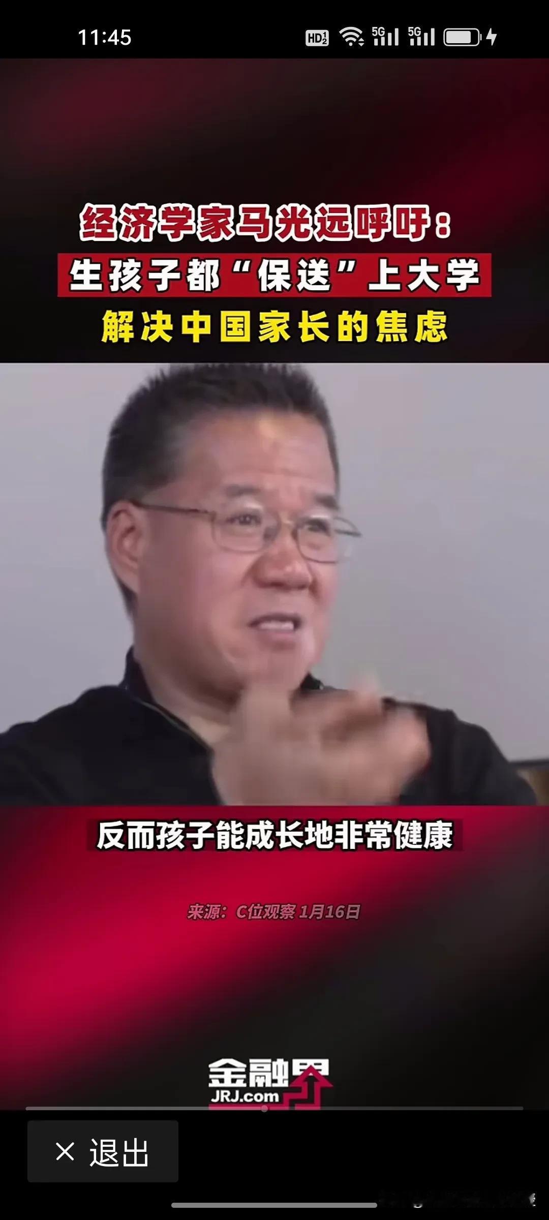 每个孩子都保送大学就能解决中国家庭焦虑? 马光远先生说“生孩子保送大学”就能解决家长焦虑,可是,现在家长的焦虑,从来不是“能不能上大学”,而是“上了大学能不能找到好工作”。如果孩子没有扎实的学习能力和真才实学,就算“保送”进大学,也可能混到毕业就失业。 现在的芯片半导体,人工智能等等行业,哪一个不需要过硬的知识储备呢?保送大学就能解决科技卡脖子问题吗? 高考的核心不是“筛选”,而是给普通家庭的孩子提供一条最公平的上升通道。如果取消选拔、全员保送,不仅会让基础教育彻底躺平,更会让阶层固化愈演愈烈。没有扎实的人才基础,科技突破、产业升级更是无从谈起。 与其空谈“保送”,不如想想怎么让大学教育更贴合就业需求,让每个努力的孩子都能拥有真正的竞争力,找到一份专业对口的好工作。