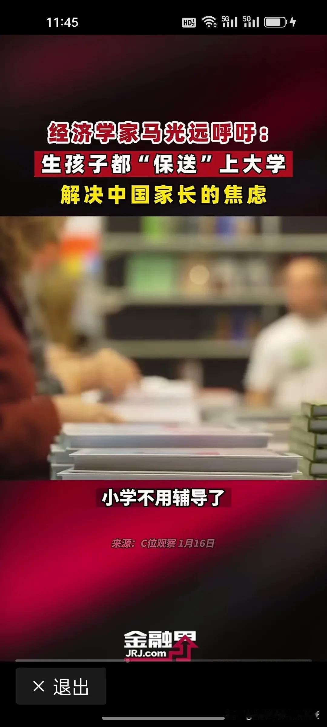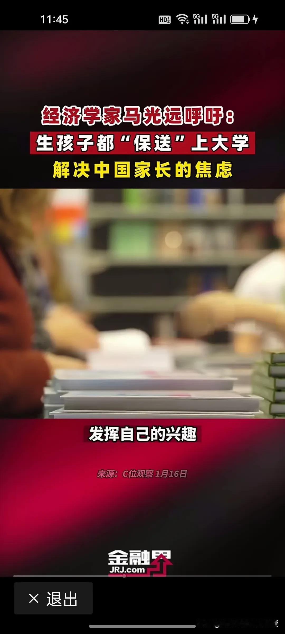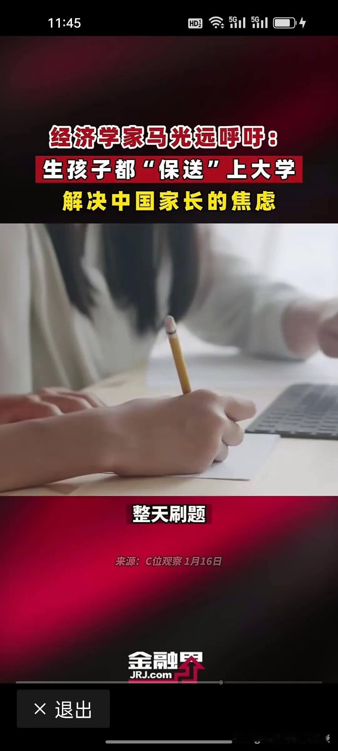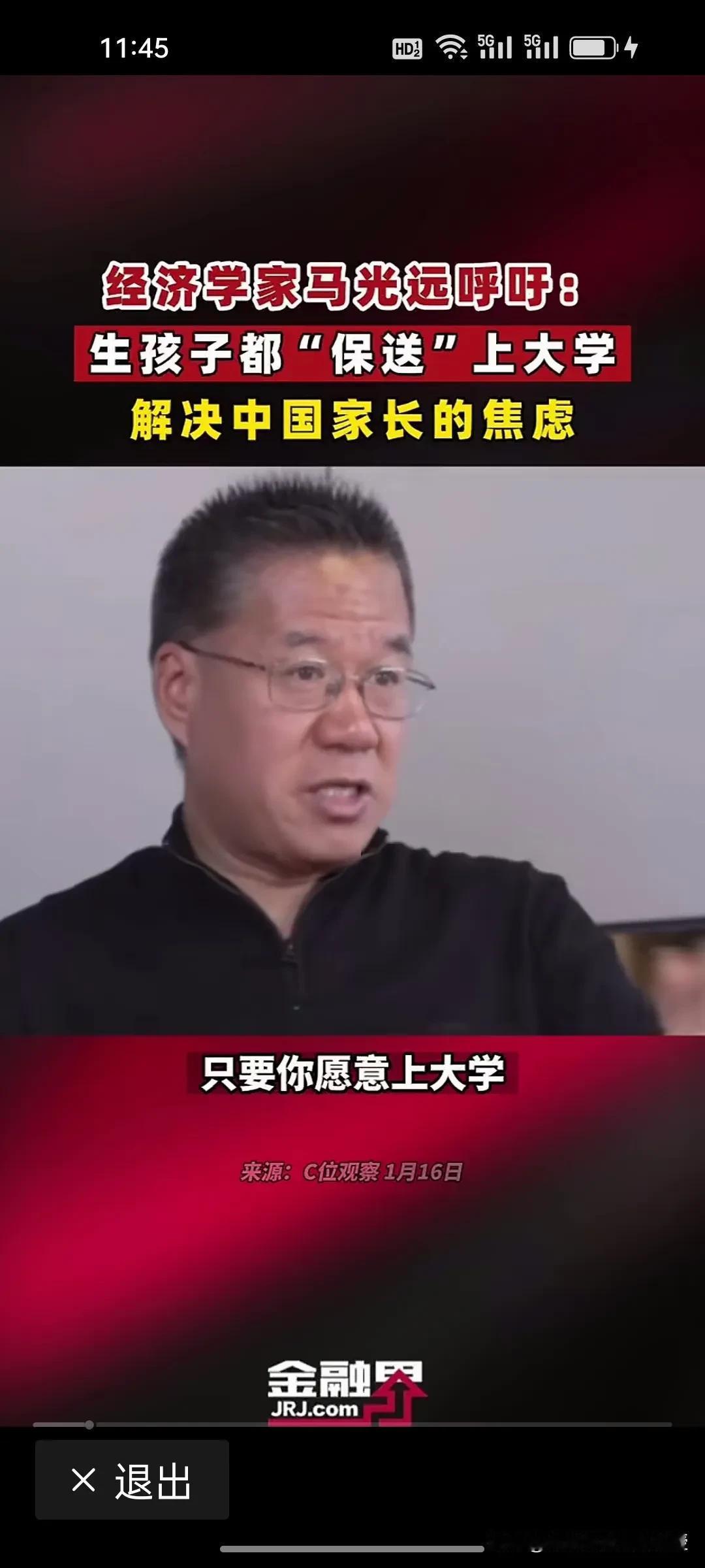每个孩子都保送大学就能解决中国家庭焦虑? 马光远先生说“生孩子保送大学”就能解决家长焦虑,可是,现在家长的焦虑,从来不是“能不能上大学”,而是“上了大学能不能找到好工作”。如果孩子没有扎实的学习能力和真才实学,就算“保送”进大学,也可能混到毕业就失业。 现在的芯片半导体,人工智能等等行业,哪一个不需要过硬的知识储备呢?保送大学就能解决科技卡脖子问题吗? 高考的核心不是“筛选”,而是给普通家庭的孩子提供一条最公平的上升通道。如果取消选拔、全员保送,不仅会让基础教育彻底躺平,更会让阶层固化愈演愈烈。没有扎实的人才基础,科技突破、产业升级更是无从谈起。 与其空谈“保送”,不如想想怎么让大学教育更贴合就业需求,让每个努力的孩子都能拥有真正的竞争力,找到一份专业对口的好工作。