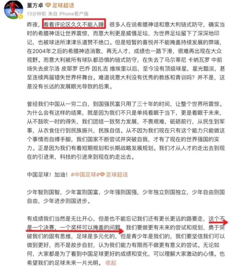 董方卓的回应之所以招球迷集体反感,不是大家护短!而是他这人说话嘴欠、做事路数全踩在了球迷 “雷区” 上!总挑毛病却不支招,就是站着说话不腰疼! 啥雷区呢?给他总结了这几点: 1、从“屎味巧克力”到“踢出传控未来”,脸变得比翻书还快! 前脚把 U23 踢法骂成 “屎味巧克力”,说看不到中国足球未来,后脚球队 3-0 赢越南进决赛,立马改口盛赞 “踢出传控未来”! 被球迷戳穿打脸,还整出 “我开心被国足打脸” 的话术,看似格局大,实则耍小聪明 —— 国足踢得差他就是 “先见之明”,踢得好他就是 “乐见其成”,横竖都是他占理,球迷看着这反复横跳的样子,只觉得虚伪又滑稽。 2、嘴欠!时机踩了“大雷”,专挑球迷开心时刻泼冷水! 国足常年拉胯,球迷憋了一肚子委屈,U23 这支青年军一路逆袭创历史进决赛,是难得的扬眉吐气! 球迷刚从压抑里喘口气,正抱着这群孩子使劲夸、尽情乐呢……结果董方卓跳出来说 “进决赛又如何,夺冠也掩盖问题”! 这就跟人家刚办喜事,你凑上去说 “别高兴太早,以后还会有糟心事” 一样,纯纯的扫兴,换谁谁不火大? 3、身份双标太膈应,拿履历压人却没说服力! 他总拿 “全亚洲没几个人能去曼联” 回怼球迷,用当年的履历摆架子,居高临下批评现役球员! 可球迷心里门儿清,他虽是曼联名宿,却没兑现天赋,职业生涯算不上成功! 这就像一个当年没考好的学长,回头对着埋头刷题的学弟学妹指手画脚,还说 “你们这学习方法不行”,球迷自然会怼:“你自己都没学成,凭什么教别人?” 4、懂球不懂味,揪着战术死犟还贬低球员努力! 他非把传控捧成 “高级货”,把防守反击贬成 “低级踢法”! 张口就说球队 “只会开大脚”,却忽略了杯赛赛场 “赢球才是王道”,也无视这群年轻人 5 场零失球的铁血防守和拼劲。 球迷看着这群孩子拼出来的成绩被这么轻描淡写否定,能不护犊子吗? 5、只挑问题不给招,站着说话不腰疼! 吐槽国足的人多了,但球迷不是听不得批评,而是反感 “只批不建” 的空喊。 董方卓光说 “夺冠也掩盖问题”“要踢漂亮足球”,却从没说过具体该怎么改、青训该怎么搞、战术该怎么练? 就像一个观众对着赛场喊 “你踢得不好”,却啥实际建议都没有,这种轻飘飘的批评,在球迷看来就是站着说话不腰疼,没半点诚意。 所以评论区那么多人怼他是有道理的—— 网友1:“董方卓没有资格评论中国足球!身为中国足球一员你为振兴中国足球做了什么贡献?不是用嘴说的,是要有行动!” 网友2:“郭德纲说,同行间才是赤裸裸的仇恨。相声圈是这样,足球圈也是。看着现在的中国队赢球,最难受的不是我们的对手,却是那些输惯了的前辈!” 网友3:“让你踢吧又不岀成绩,人家U23这批队员成绩摆在这了,你又说场面不好看,其实很简单,去带一支队伍不管哪个级别超过他,看你怎么摆龙门阵赢球。” [呲牙]说到底,球迷不是反对理性批评国足,更不是盲目护短,而是反感董方卓这种 “时机不对、态度虚伪、双标又空泛” 的批评。 各位觉得我说的有没有道理?欢迎在评论区补充说明……