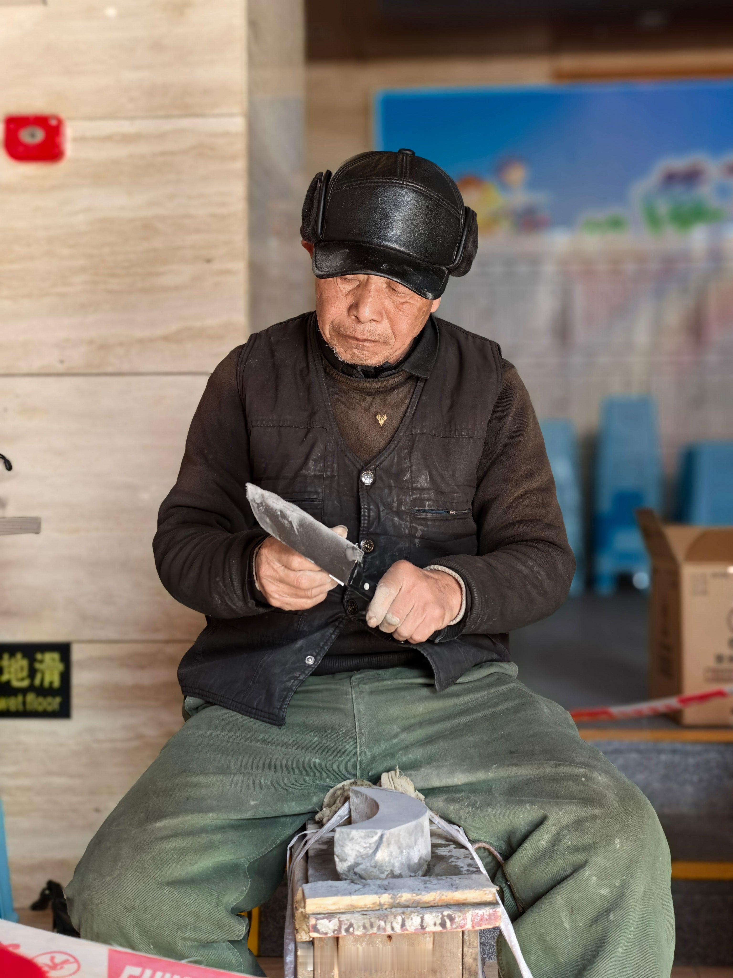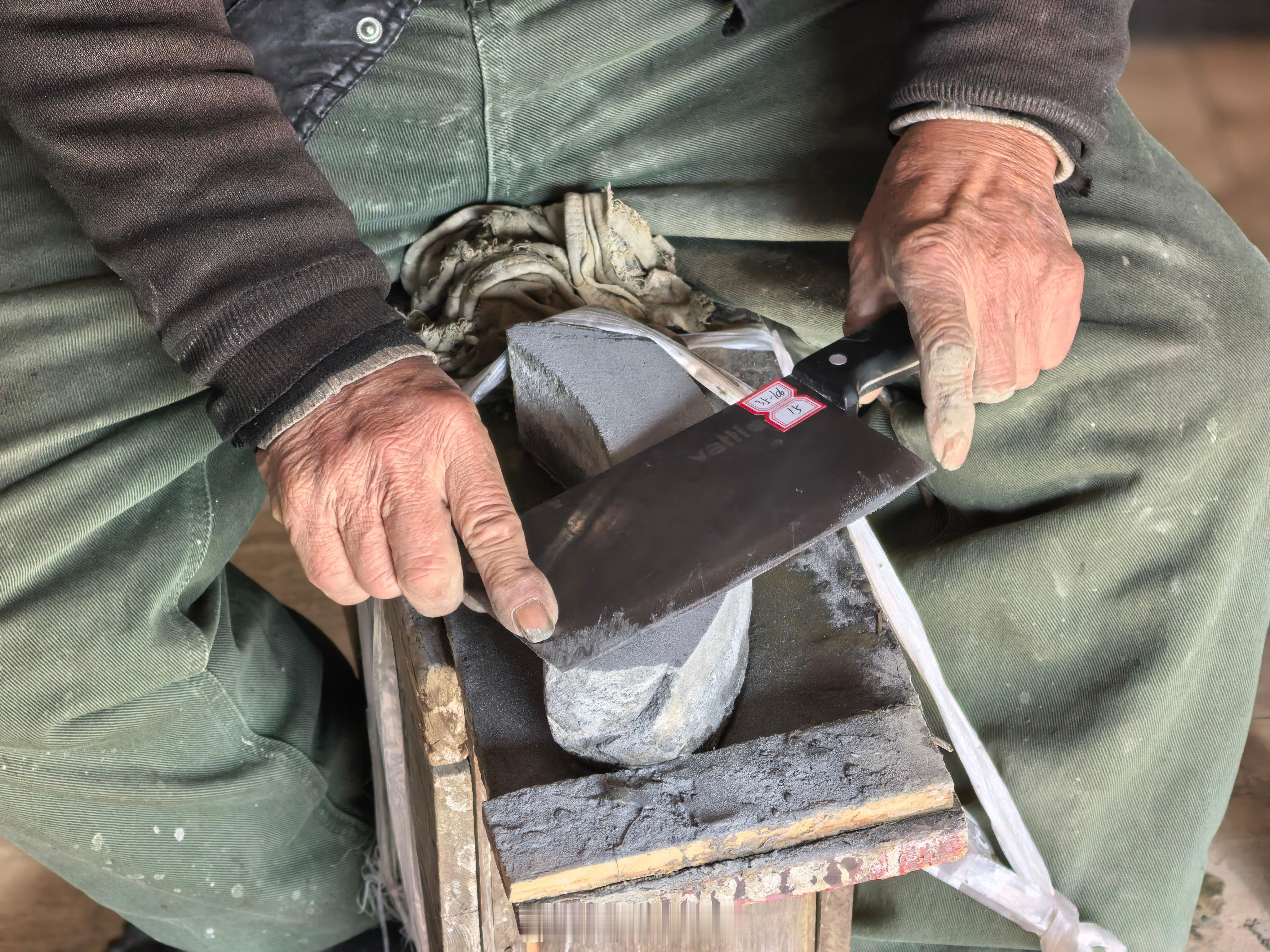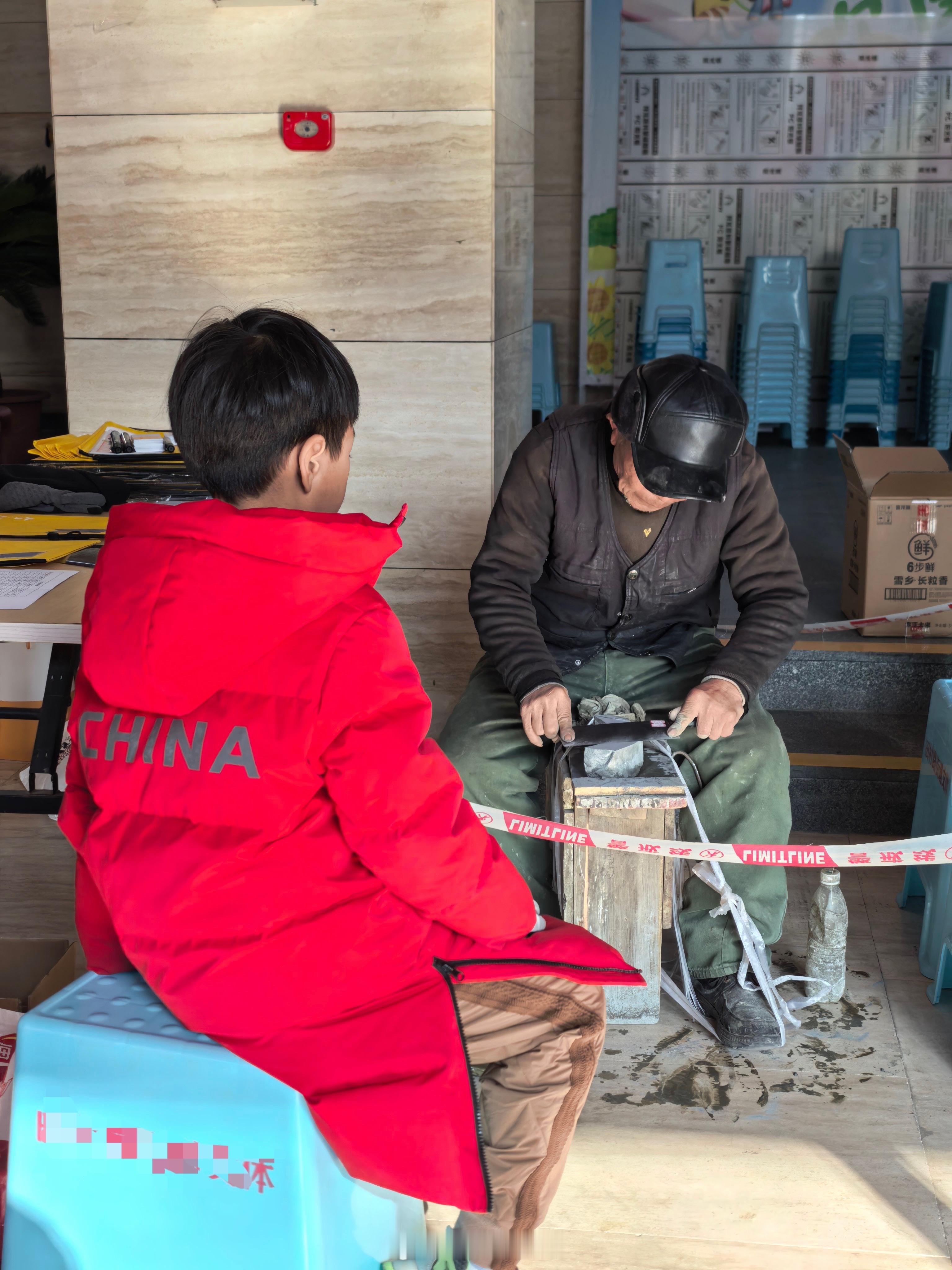 快过年了,物业给业主们组织磨刀具。孩子是第1次见,现在这样的手艺人越来越不好找了