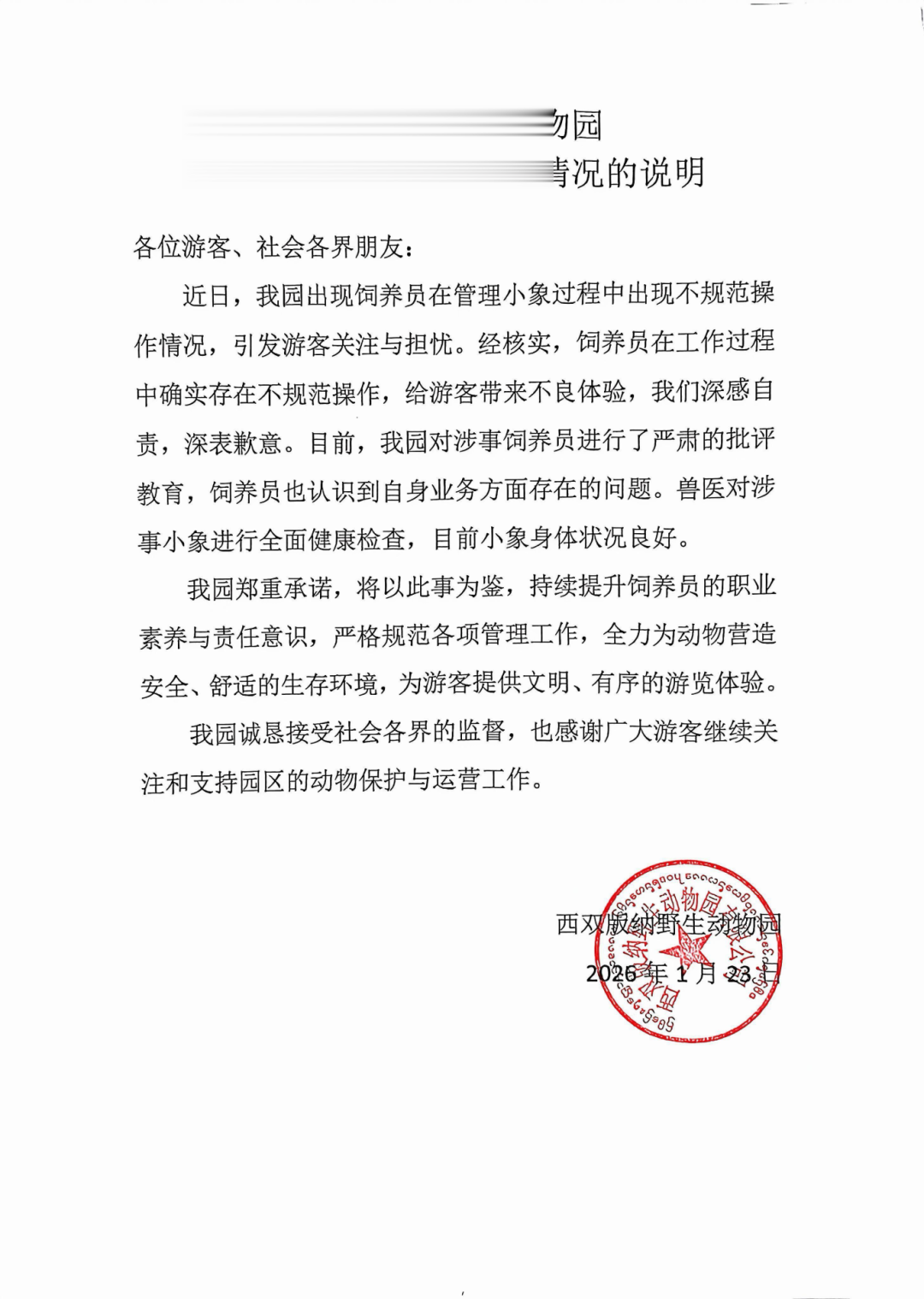 说明内容为:近日,我园出现饲养员在管理小象过程中出现不规范操作情况,引发游客关注与担忧。经核实,饲养员在工作过程中确实存在不规范操作,给游客带来不良体验,我们深感自责,深表歉意。目前,我园对涉事饲养员进行了严肃的批评教育,饲养员也认识到自身业务方面存在的问题。兽医对涉事小象进行全面健康检查,目前小象身体状况良好。