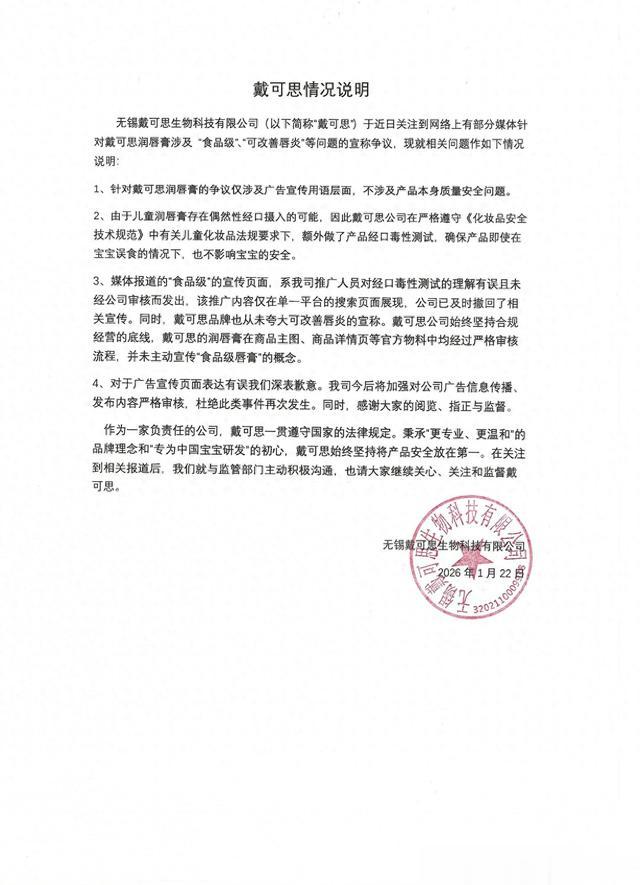 戴可思方面解释,由于儿童润唇膏存在偶然性经口摄入的可能,因此公司在严格遵守《化妆品安全技术规范》中有关儿童化妆品法规要求下,额外做了产品经口毒性测试,确保产品即使在宝宝误食的情况下,也不影响宝宝的安全。“今后将加强对公司广告信息传播,发布内容严格审核,杜绝此类事件再次发生。”