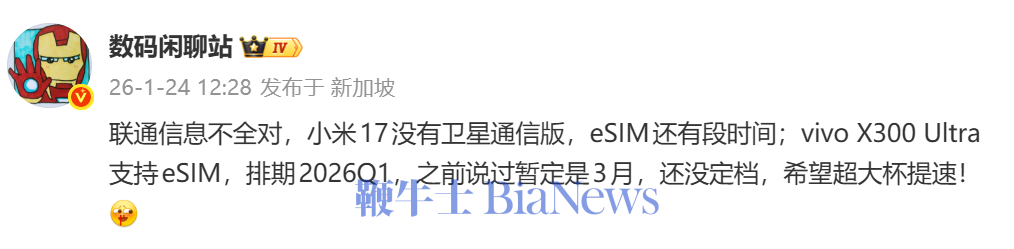 今日,科技博主数码闲聊站透露,小米17没有卫星通信版,但后续将提供eSIM支持;vivoX300Ultra同样支持eSIM,虽然具体发布日期未定,但确认排期2026Q1。
