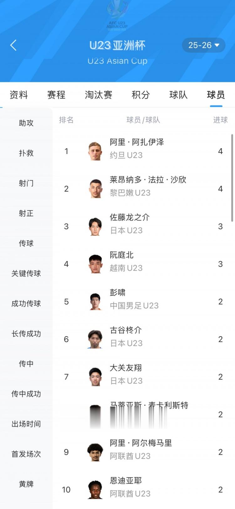 直播吧1月24日讯U23亚洲杯决赛,U23国足将与日本U23队争夺冠军。截至决赛前,U23国足球员彭啸攻入2球,并列本届亚洲杯射手榜第五,日本U23队共有3人进入射手榜前十。