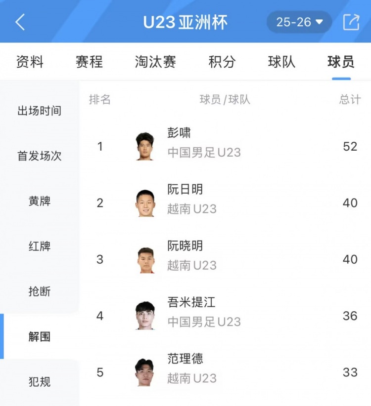 直播吧1月24日讯U23亚洲杯决赛,U23国足将与日本U23队争夺冠军。数据统计方面,U23国足中后卫彭啸贡献了52次解围,排名本届U23亚洲杯解围榜第一。此外,吾米提江贡献36次解围,排名第四。