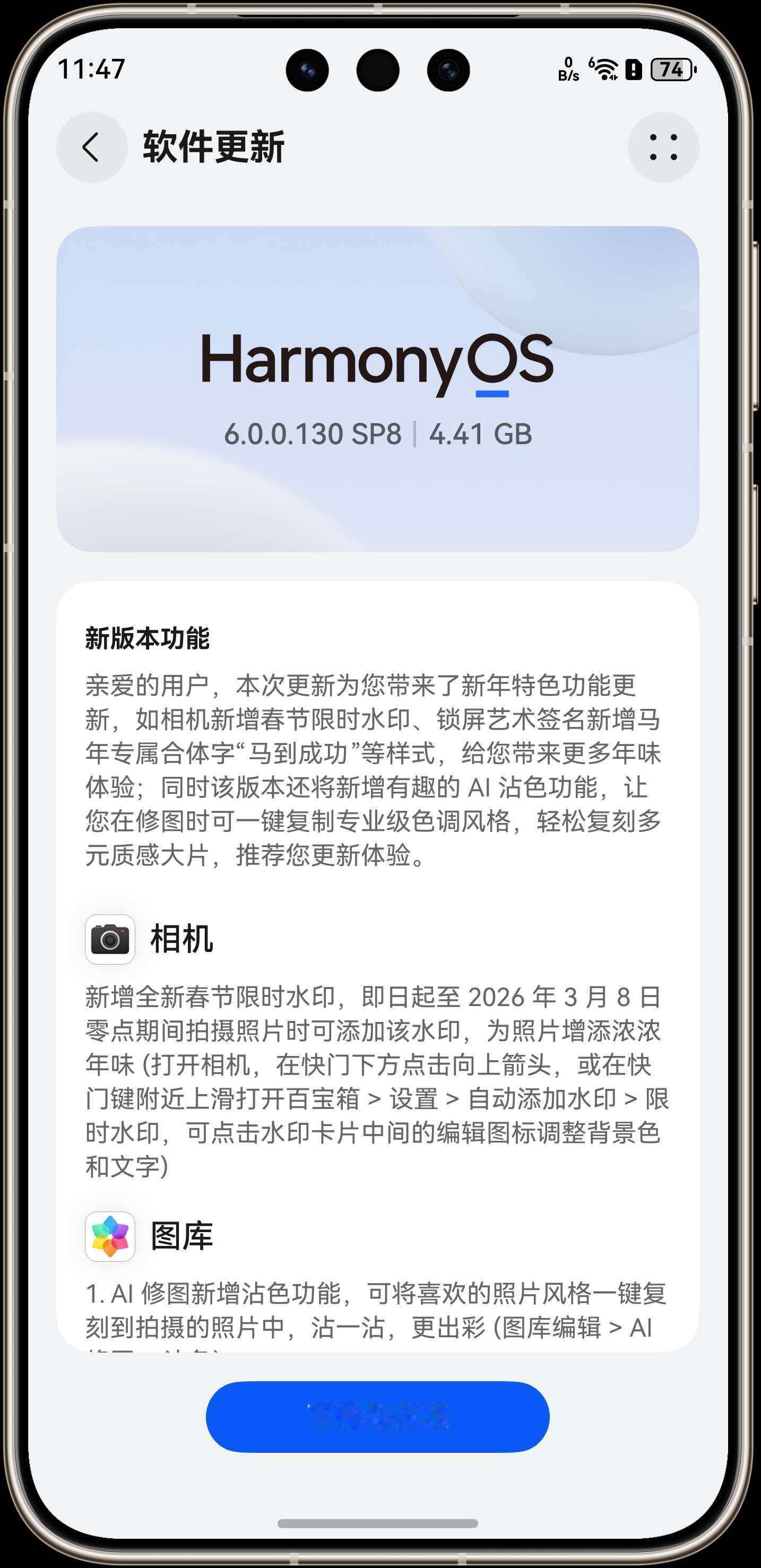 鸿蒙6.0.0.130开始推送了,本次更新主要是多项春节功能,包括春节限时水印、