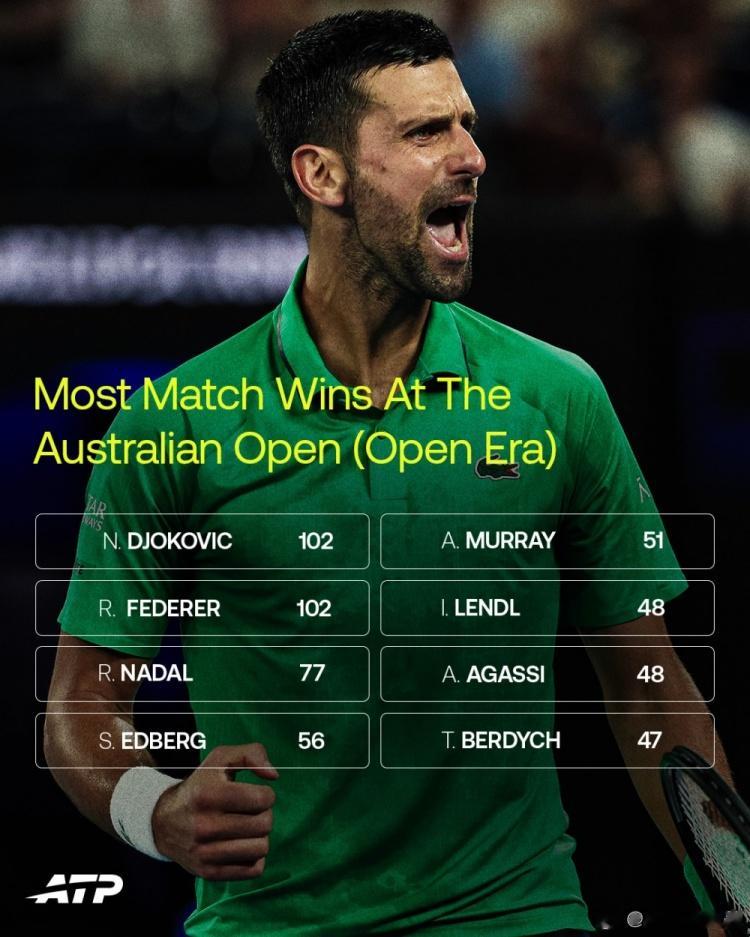 凭借本场胜利,德约科维奇职业生涯澳网胜场数来到102胜,追平费德勒,并列公开赛年代第一位。