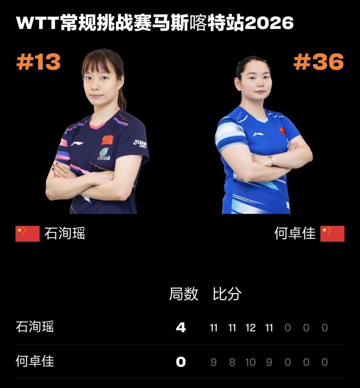 WTT常规挑战赛马斯喀特站丨女单决赛 石洵瑶🇨🇳4-0何卓佳🇨🇳【11-9,11-8,12-10,11-9】 石洵瑶🇨🇳获得WTT常规挑战赛马斯喀特站女单冠军🥇🎉 何卓佳🇨🇳获得WTT常规挑战赛马斯喀特站女单亚军🥈