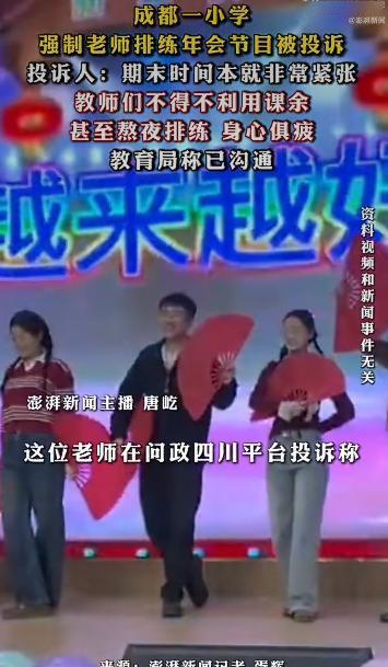 成都一所小学的老师们,在期末最忙的时候,被学校要求必须参加年会节目的排练,结果有老师实在受不了,上网投诉了这件事。 事情是这样的,这所小学叫成都师范附属小学慧源校区,期末阶段本就是老师们一年中最忙的时候。他们不仅要忙着总结课程、给学生写评语,还要筹备家长会,处理各种教学上的收尾工作。时间本来就紧张得不行,可学校这时候却突然要求全体老师都必须参加年会的节目表演,而且排练时间还安排在了课余和晚上,有的老师甚至要熬夜排练,第二天还得照常上课。这样一来,老师们不仅身体累得不行,心里也觉得特别委屈。 有位疑似该校的老师在投诉平台上说,他们不是演员,而是教师,主要任务是教书育人,不是上台表演。现在学校这么一搞,他们不得不把大量的时间和精力都花在排练上,教学任务反而受到了影响。更让老师们难以接受的是,排练还是强制性的,谁要是不参加,可能会被认为是不配合学校工作,影响评优和晋升。 这件事很快就在网上传开了,大家纷纷议论,有的说学校这么做太不人性化了,完全不顾老师的感受;也有的说,年会节目本来是为了庆祝,现在却变成了老师的负担,失去了原本的意义。面对舆论的压力,当地教育局很快介入了调查,并和投诉的老师进行了电话沟通。据教育局回应,投诉的老师对沟通结果表示认可,但具体是怎么处理的,有没有取消强制排练,有没有对相关责任人进行问责,这些都没有公布。 其实,这起事件并不是个例,它反映出了当前教育管理中存在的一个普遍问题,那就是教师的非教学负担过重。除了教书育人,老师们还要承担各种与教学无关的任务,比如参加各种会议、活动,甚至还要承担一些行政工作。这些任务不仅占用了老师们大量的时间和精力,还让他们感到身心俱疲,严重影响了教学质量和老师的职业幸福感。 好在,相关部门已经意识到了这个问题,并出台了一系列措施来减轻教师的非教学负担。比如,明确禁止强制教师参与非教学活动,对进入校园的社会事务实行“白名单”管理等等。希望这些措施能够真正落到实处,让老师们能够安心教书,快乐育人。 来源:澎湃新闻