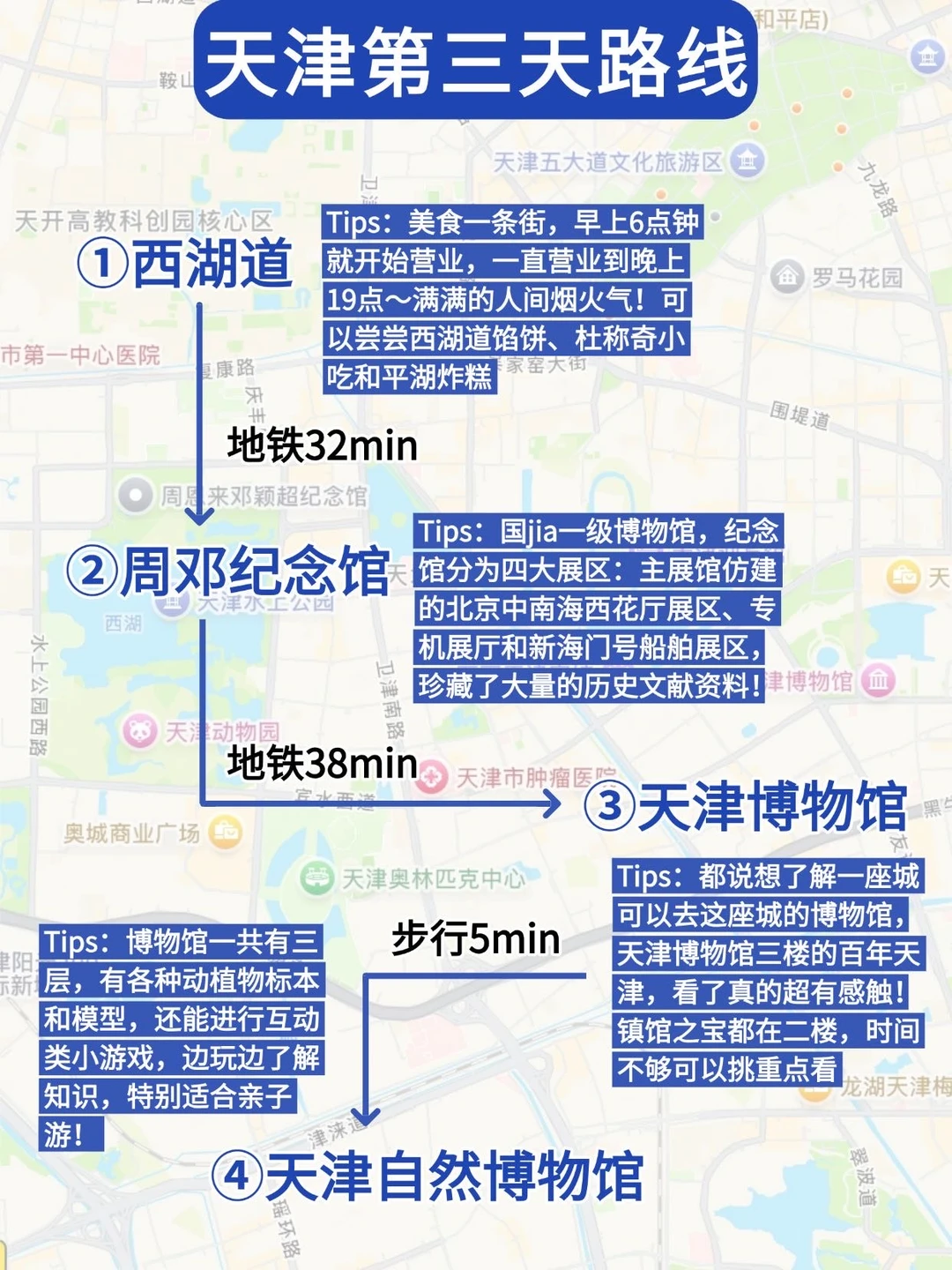 准备去天津玩 4 天,终于熬夜把攻略做好啦!!!姐妹们可以直接抄作业!门票🎫记得提前🐟约好,第一天和第二天有些景点其实挨着挺近的,如果时间不够可以选自己感兴趣的景点去哦 - ✅天津具体出行计划 🌆Day1:抵达天津→天津之眼→古文化街→意式风情区→世纪钟→津湾广场 🌉Day2:西开教堂→瓷房子→滨江道→小白楼→五大道 🌅Day3:西湖道→周邓纪念馆→天津博物馆→天津自然博物馆 🌌Day4:滨海站→海洋博物馆→东疆亲海公园→老码头→大梁子渡口 .