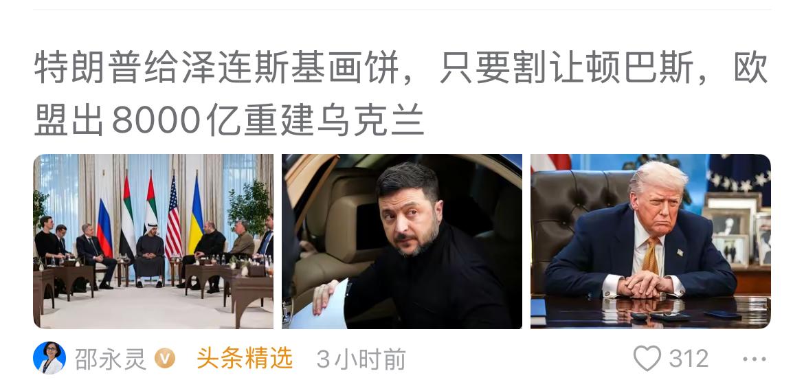 川普这个饼画的够大,八千亿重建乌克兰,让小乌尽快签协议,忽悠斯基让乌军撤出顿巴斯!八千亿啊,那可不是八百亿,一旦签了和平协议,到时候大家慢慢挤牙膏,到了下一任,不认这个承诺也有可能!其实乌克兰心里也明白,很可能是个空头支票,但是眼下架在半空中,不相信这个饼又该相信什么呢!