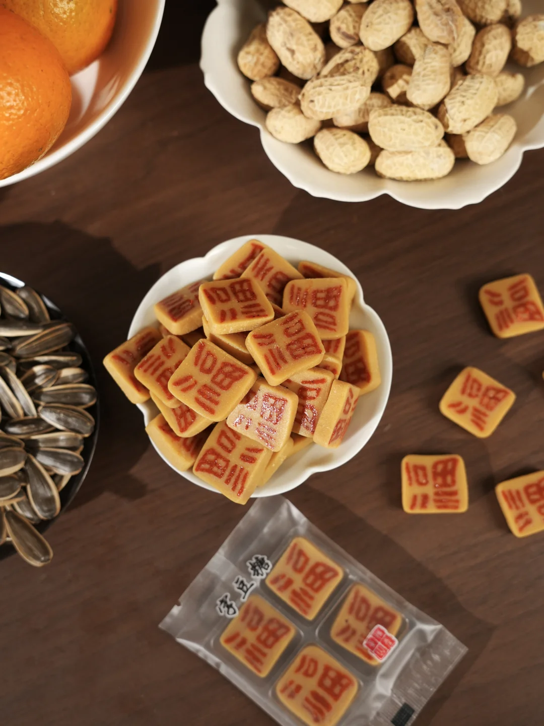 你见过把字放在糖的美食吗? 每吃一个都是在积攒福气~ 这也太适合过年了!! 为了新年 我们特意把字做成了红色 原料用的是枸杞 没有任何色素添加 外面也是麦芽糖和面粉组成 口感有点嚼劲 一点也不甜腻 是黄豆的清甜 吃一口就会改变对糖果的看法 现在我们上了新年装 这个马年尝试一下特别的新年糖~