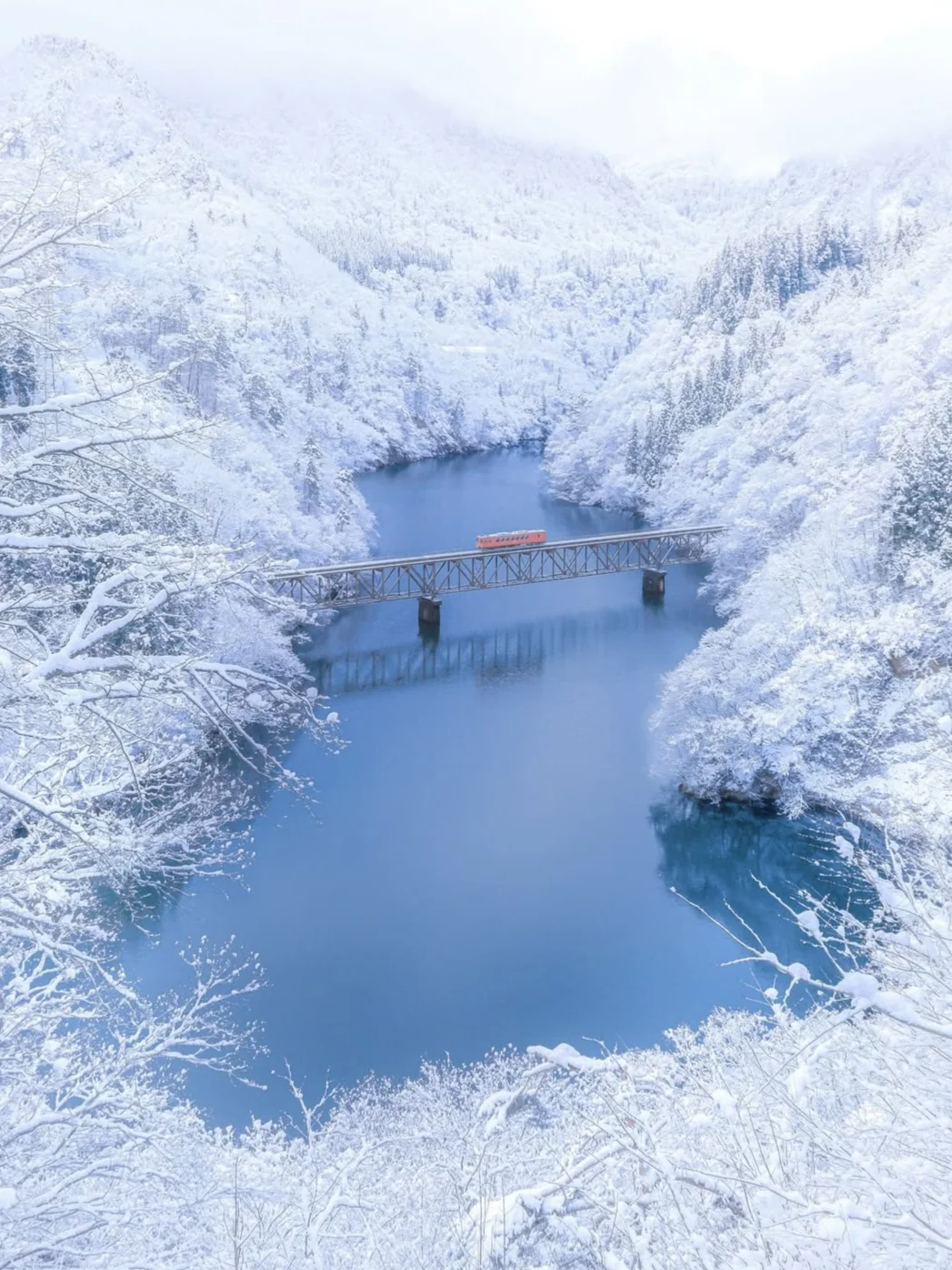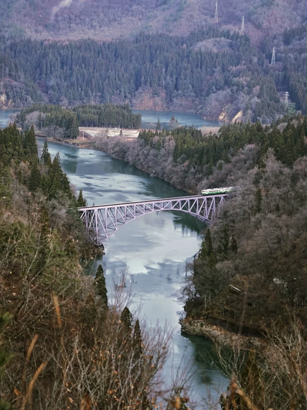 火车沿着河走。窗外是水、山、树林,还有零散的村落。有些站台很小,一天只有几班车,列车停下来时,周围几乎没有声音。 更多时候,只是坐着。看景色慢慢往后退,不太会注意时间。雾起来的时候,第一只见川桥梁像是从山里浮出来。那一刻会明白,为什么有人愿意在这里等很久。 —— 🚞 只见线乘坐攻略 📍 线路位置 只见线 连接福岛·会津若松 ⇄ 新潟·小出 全程普通列车,没有新干线。 👉 推荐坐法 第一次不必坐完全程:会津若松 → 会津宫下 / 只见(往返)精华景色集中在这一段。最好看的区间:会津宫下 ~ 早户。第一只见川桥梁就在附近,适合拍照打卡。 ⏰ 班次提醒 大概1–2小时一班,部分车站更少,一定提前查时刻表! 🍁 季节建议 10月下旬–11月初:最稳定,冬天雪景很好,但容易停运。 🍱 吃与住 沿线几乎没有餐厅, 建议在会津若松准备便当。 住宿也推荐住会津若松,行动最自由。