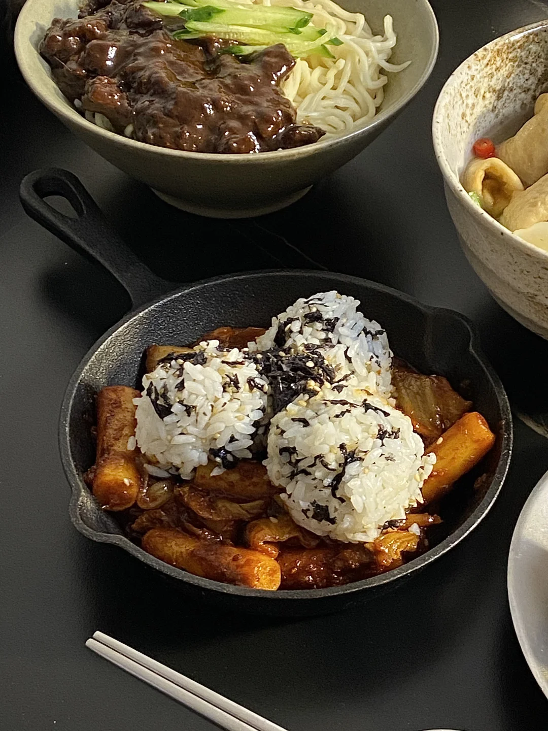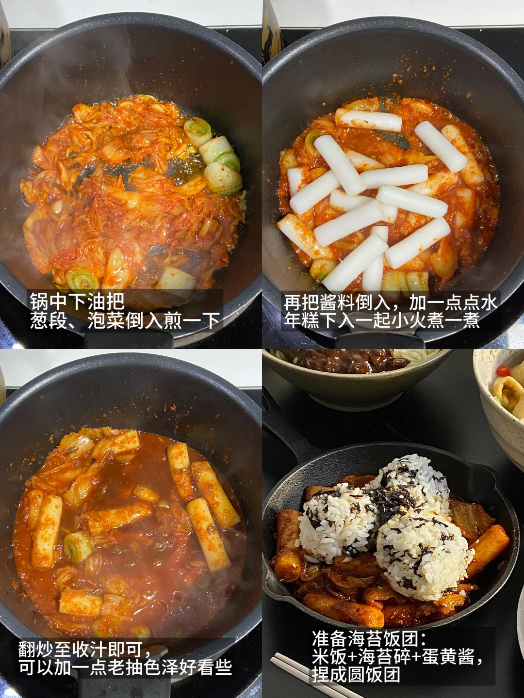 1)锅中下油把葱段、泡菜倒入煎一下,再把酱料倒入,加一点点水,年糕下入一起小火煮一煮,翻炒至收汁即可,我又加了一点老抽色泽好看些