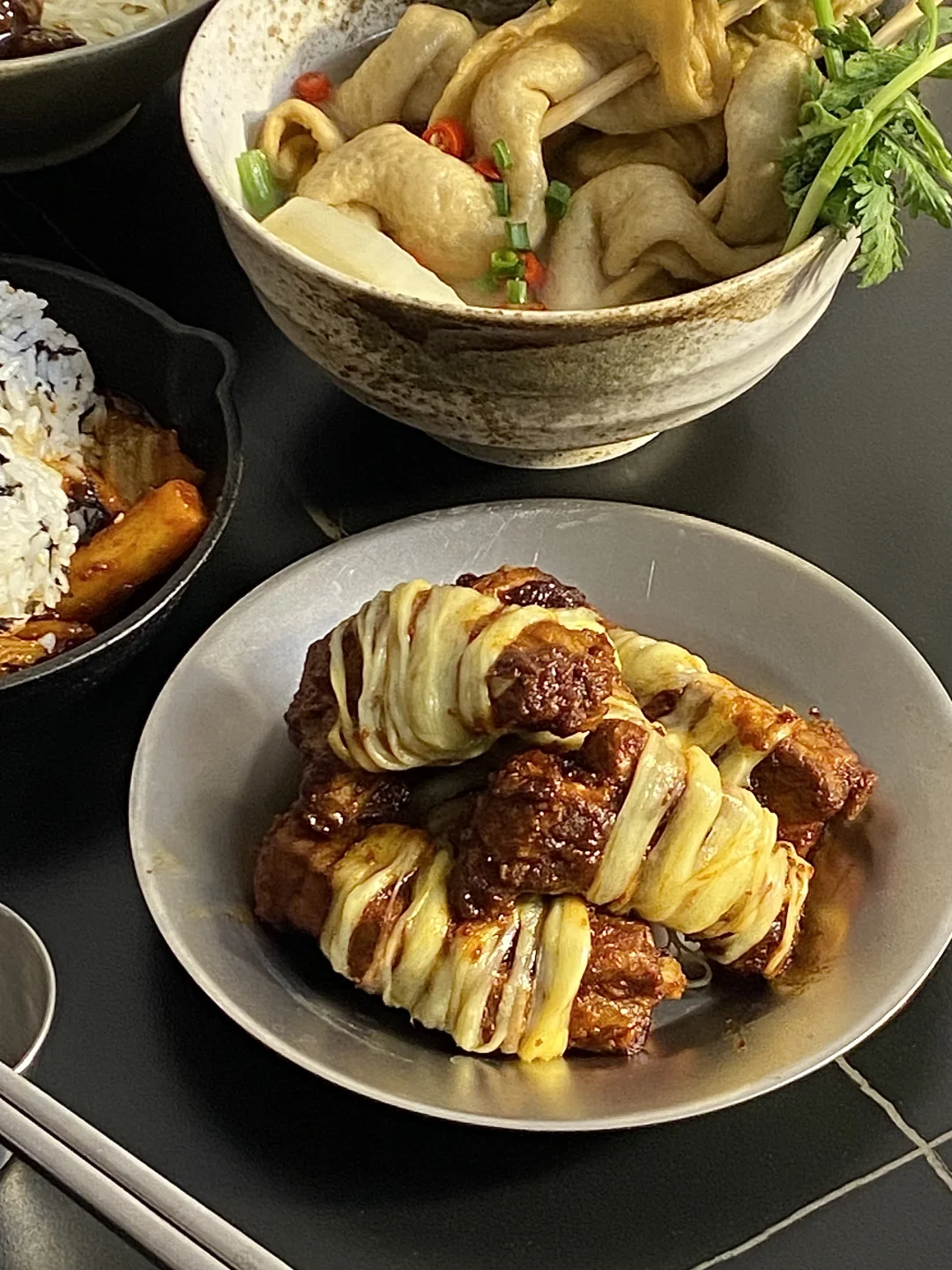 3)最后加一点老抽调色,可以再加一点盐调味,把准备好的马苏里拉芝士倒在小锅里加热然后裹在排骨上