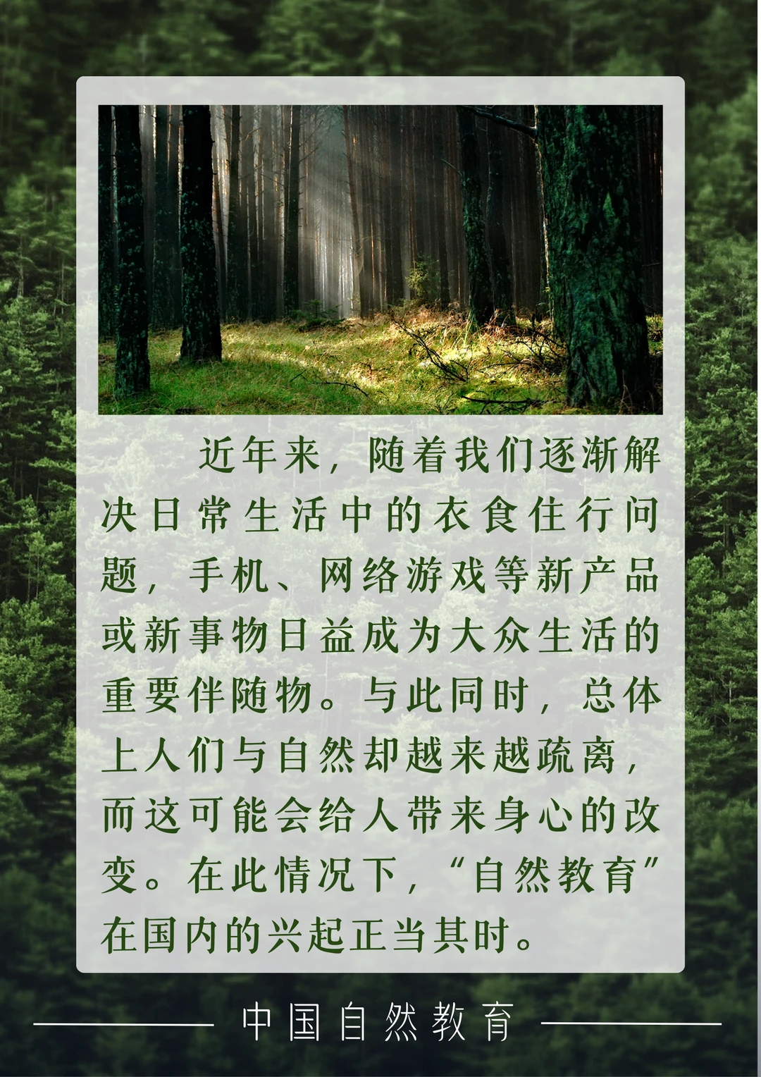 近年来,随着我们逐渐解决日常生活中的衣食住行问题,手机,网络游戏等新产品或新事物日益成为大众生活的重要伴随物。与此同时,总体上人们与自然却越来越疏离,而这可能会给人带来身心的改变。在此情况下,"自然教育"在国内的兴起正当其时。
