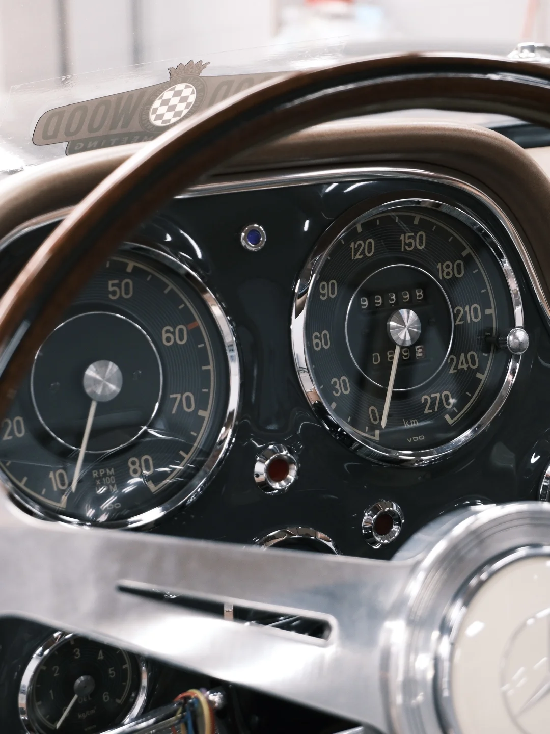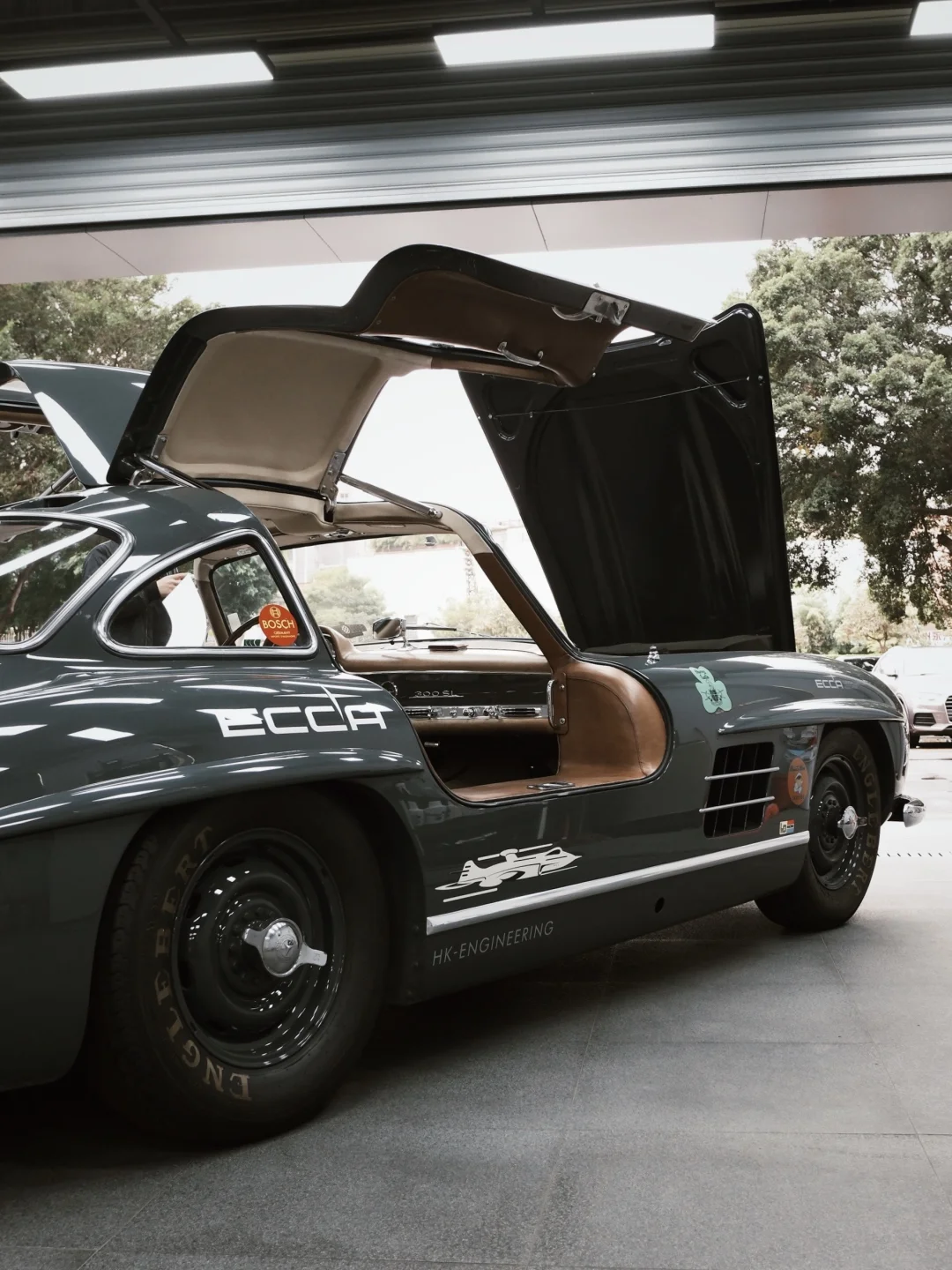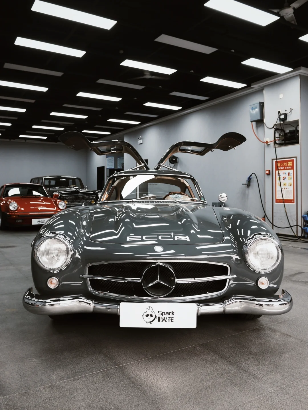 论50年代跑车设计,经典代表当属捷豹D-type/XKSS与奔驰300SL。此次体验300SL,忍不住拿自家E-Type来对比。 300SL的标志性鸥翼门辨识度拉满,轻量化管状车架造就高侧梁与宽门槛,诞生了这一标志性设计,上下车甚至要拆卸方向盘。驾驶舱紧凑直立,神似飞机座舱,满是严谨精密。反观E-Type,坐入姿态更低更顺滑,人如同滑入低矮座舱,双腿前伸,运动感直接拉满。 内饰上,300SL仪表板侧重实用,表盘排布紧凑,速度表与转速表居中,其余辅助仪表全在眼前,尽显工程风格。E-Type则将两大圆形主表盘置于驾驶者正前方,其余小表盘与开关错落排布中控,自带英式运动格调。 点火那瞬间… 300SL直列六缸燃油喷射发动机,启动声清脆平稳,是机械的精准克制;E-Type的XK发动机则截然不同,点火即迸发浑厚低吼,怠速声深沉有情,满是浪漫气息。 此番近距离体验这台梦中情车,还是感受独特。感谢和spark