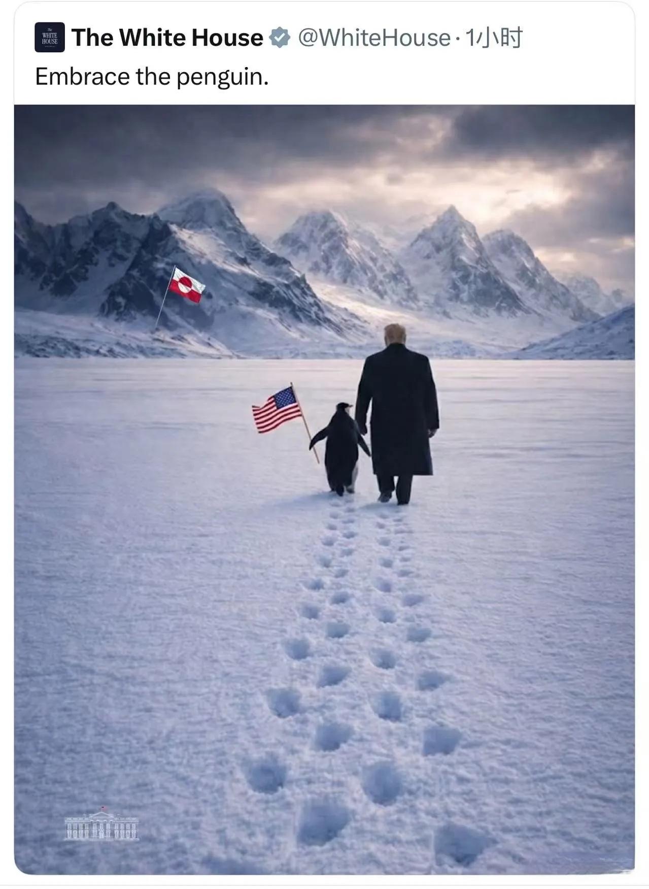 格陵兰岛人还是有想法的,上午美国白宫AI做了一张图,下午格陵兰岛就回敬白宫,而且还是视频。 美国白宫发布了一张照片,特朗普的背面牵着一个企鹅,走在格陵兰岛茫茫的雪地上,企鹅手上拿着美国旗子,不远处是格陵兰岛旗子。 而格陵兰岛人直接把图片该成了动态图,从左边冲出四只北极熊,两只熊把特朗普以及美国旗子扑倒,按到在地,另外两只熊把被绑架的企鹅拥入怀中进行保护。 白宫对企鹅是宠爱有加,把南极企鹅请到北极,而格陵兰岛北极熊还是要保护南极企鹅,来者是客,不能在北极受到伤害。 如今的南极企鹅,被白宫突然拉到北极,一下就成为了网红,流量也大涨,看来,企鹅应该生活在北极会好一些,至少美国人会这样觉得,不然怎么会在北极的特朗普和南极的企鹅在一起呢。