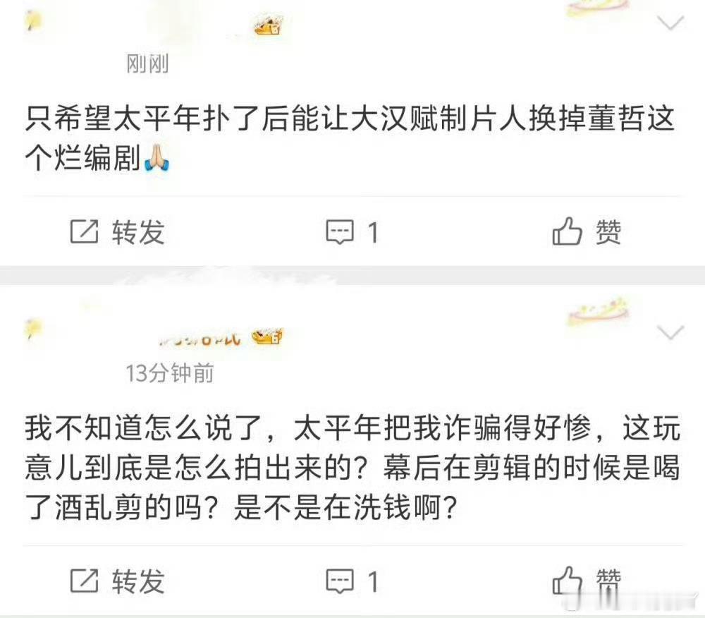 这样看太平年导演杨磊的剧和编剧董哲的剧不香了,现在太平年好像连细糠都算不上,我觉得画面拍的黄噗噗的,编剧也被骂了,还是大汉赋的编剧……大汉赋自求多福吧