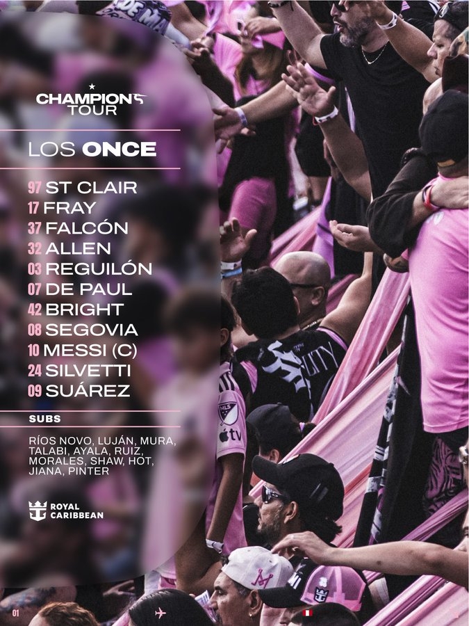 迈阿密国际首发阵容:97-圣克莱尔、17-伊恩·弗雷、37-法尔肯、32-阿伦、3-雷吉隆、7-德保罗、42-布莱特、8-塞戈维亚、10-梅西、24-西尔维蒂、9-苏亚雷斯