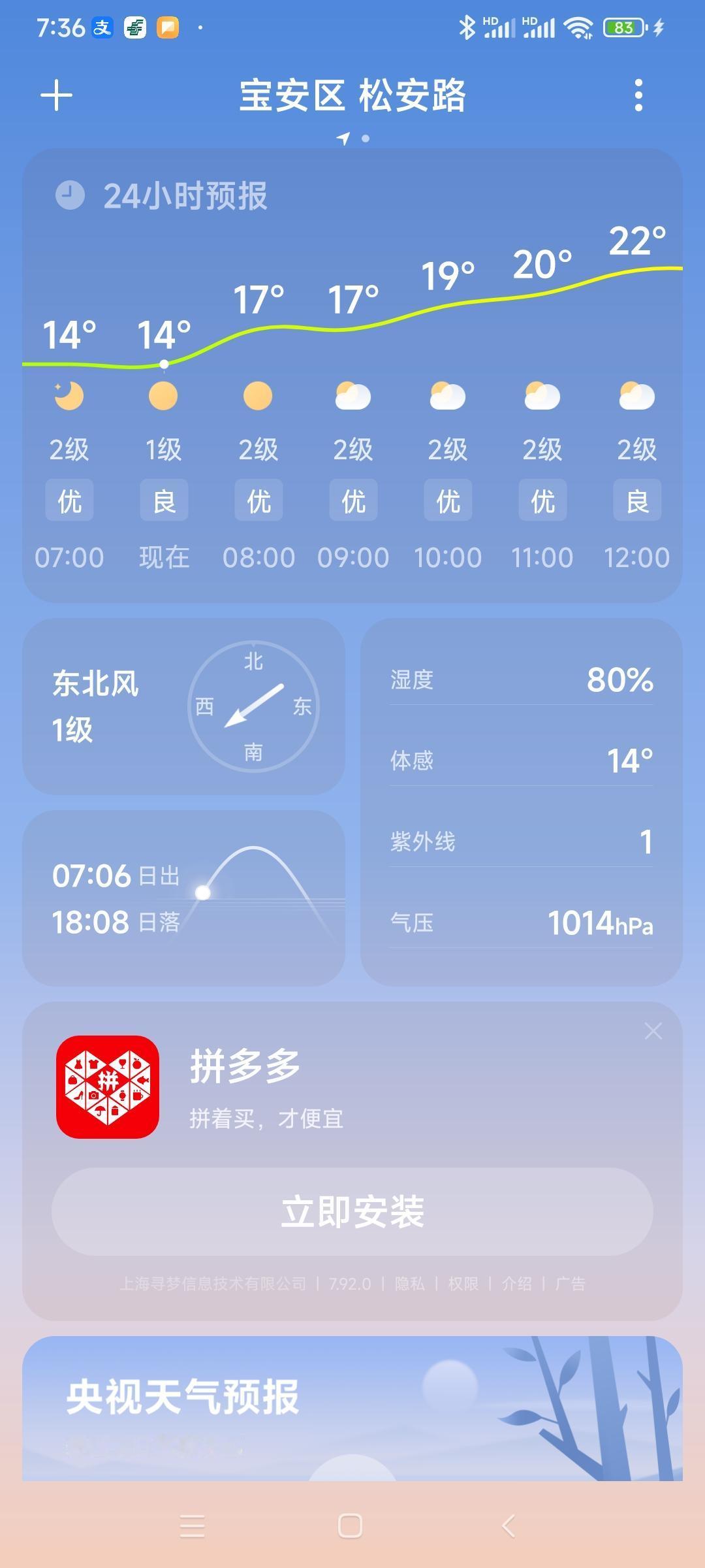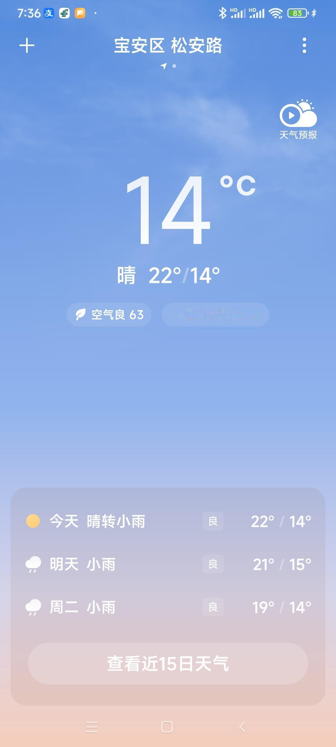 我的今日状态:😁轻松愉快 我这里的天气:☀️晴天,深圳今日晴转小雨,气温14度