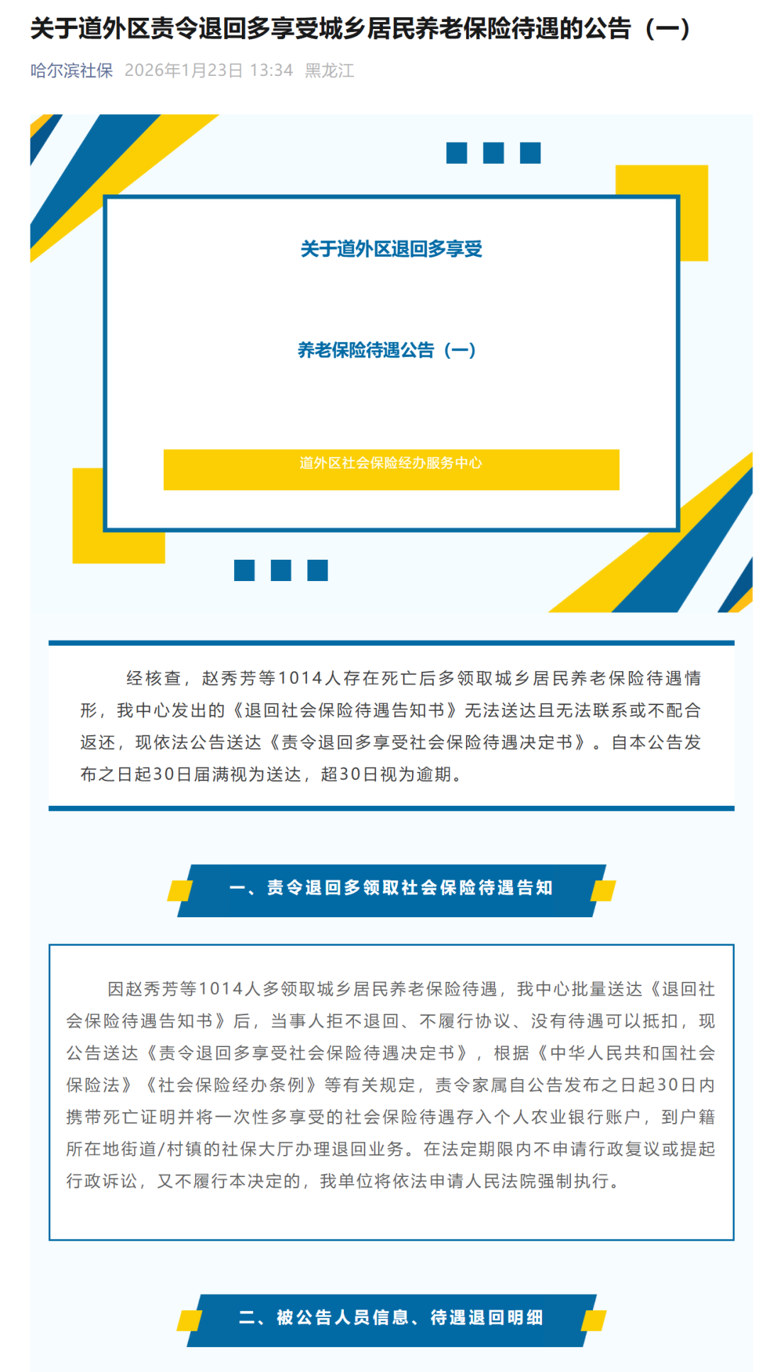 哈尔滨市道外区社保中心发现,有1014名居民(名单见附件)去世后,其家属仍然在领取养老金,属于多领、冒领。