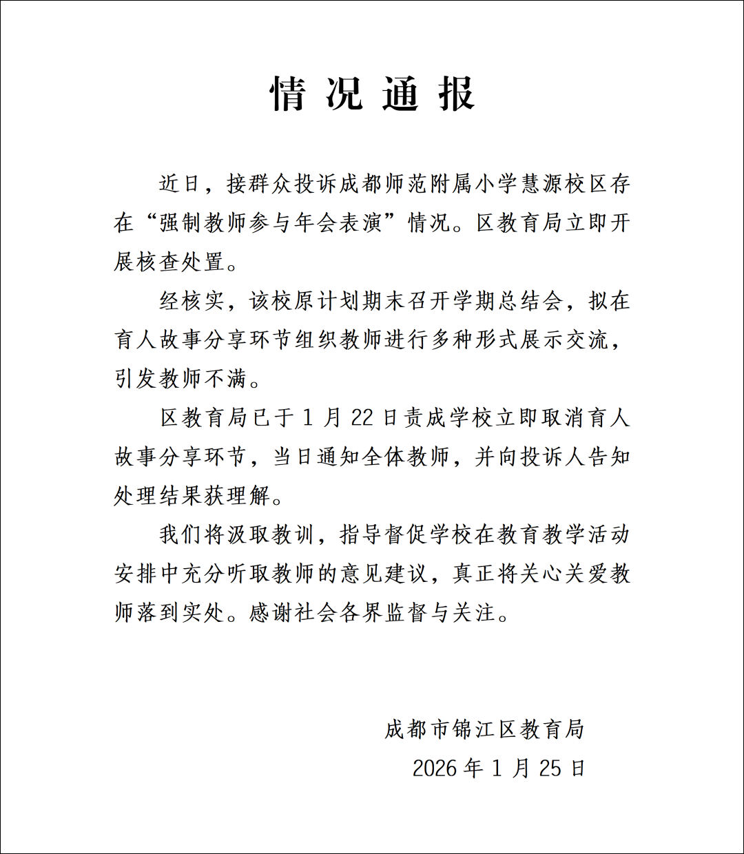 近日,接群众投诉成都师范附属小学慧源校区存在“强制教师参与年会表演”情况。区教育局立即开展核查处置。