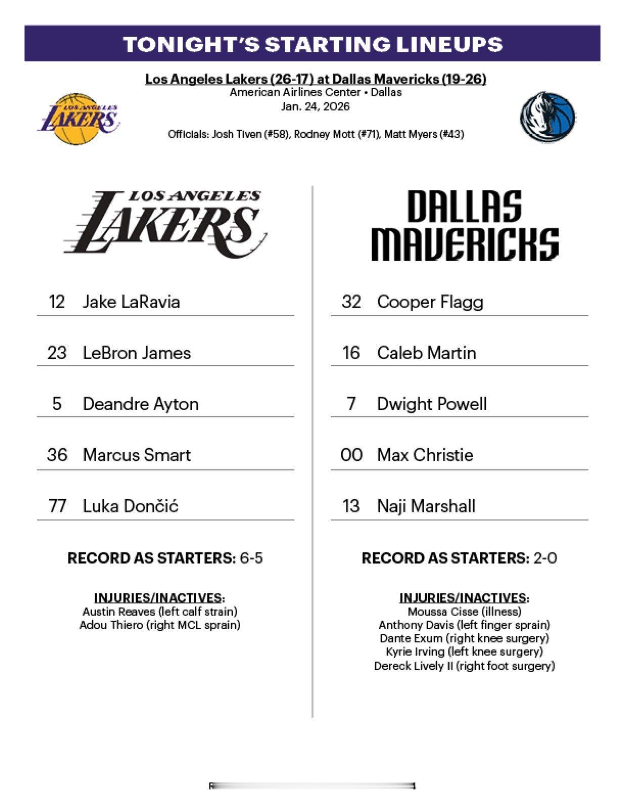 湖人首发:东契奇、斯玛特、拉拉维亚、詹姆斯、艾顿独行侠首发:马绍尔、克里斯蒂、马丁、弗拉格、鲍威尔