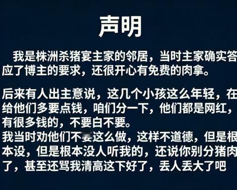 株洲被吐槽不冤——21日舆论发酵,24日依然没有清晰、准确的调查结论——就这工作效率,相关人员该问责了。任由舆论发酵对株洲城市形象的影响太大了! 现在的线索集中到村里主家的侄子身上——这是个坏事的模子,本来说好的事,让他搅黄了,唆使他人、胡搅蛮缠、坐地起价! 整个事件很清楚,漫天要价坐实了吧?动刀子坐实了吧?堵路不让出村坐实了吧?猪肉被分坐实了吧?!——这个调查难在哪里?! 一个杀猪宴,就4桌,场地费、卫生费、柴火费、用水用电能要2000块,这是穷疯了,还是“宰人”呢?! 由株洲杀猪宴“宰人”,细想农村的基层组织建设、村委班子建设、民风精神文明教育等等,在很多地方可能就是放任自流的——这已经不是新市村第一次闹这种事了,以前有人来办杀猪宴也闹过矛盾,就连承包个鱼塘,都有人跳出来闹抢——这就是当地民风和基层涣散的生动写照,也是地方工作不实注脚——不出事便罢,一出事就是丢人现眼、臭名远扬! 看来事件处理难产,也是有不得已的苦衷啊! 不过,这个村确实要整顿了,尤其是村委会! 大家说呢?