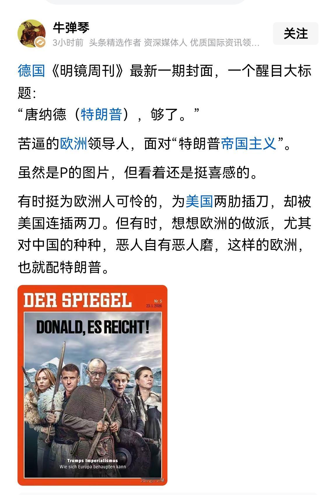 一句话戳穿欧洲人决心反抗的伪装,德国人担不起团结欧洲的重担,因为欧洲各国骨子里的自私与傲慢让她们“人菜瘾大”无法做到团结一致。 所以“够了,特朗普”,只是懊恼特朗普不应该把她们摆上餐桌。因为她们一直以为自己是坐在大人那桌吃饭分享利益的,万万没想到自己居然变成了主桌上的一盘菜了。 所以欧洲要想保住自己的尊严,必须真刀真枪的与美国干起来了。而不是老想让中美发生冲突,自己坐收渔利。