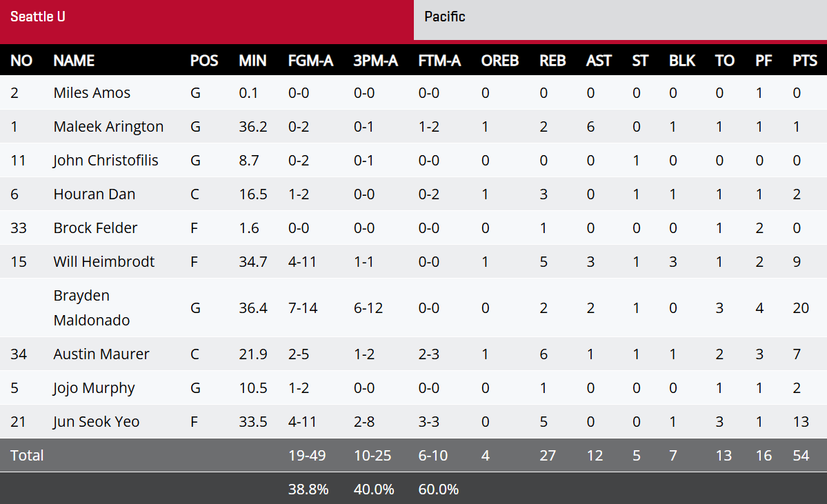 虎扑01月25日讯今日NCAA常规赛,西雅图大学54-56不敌太平洋大学。