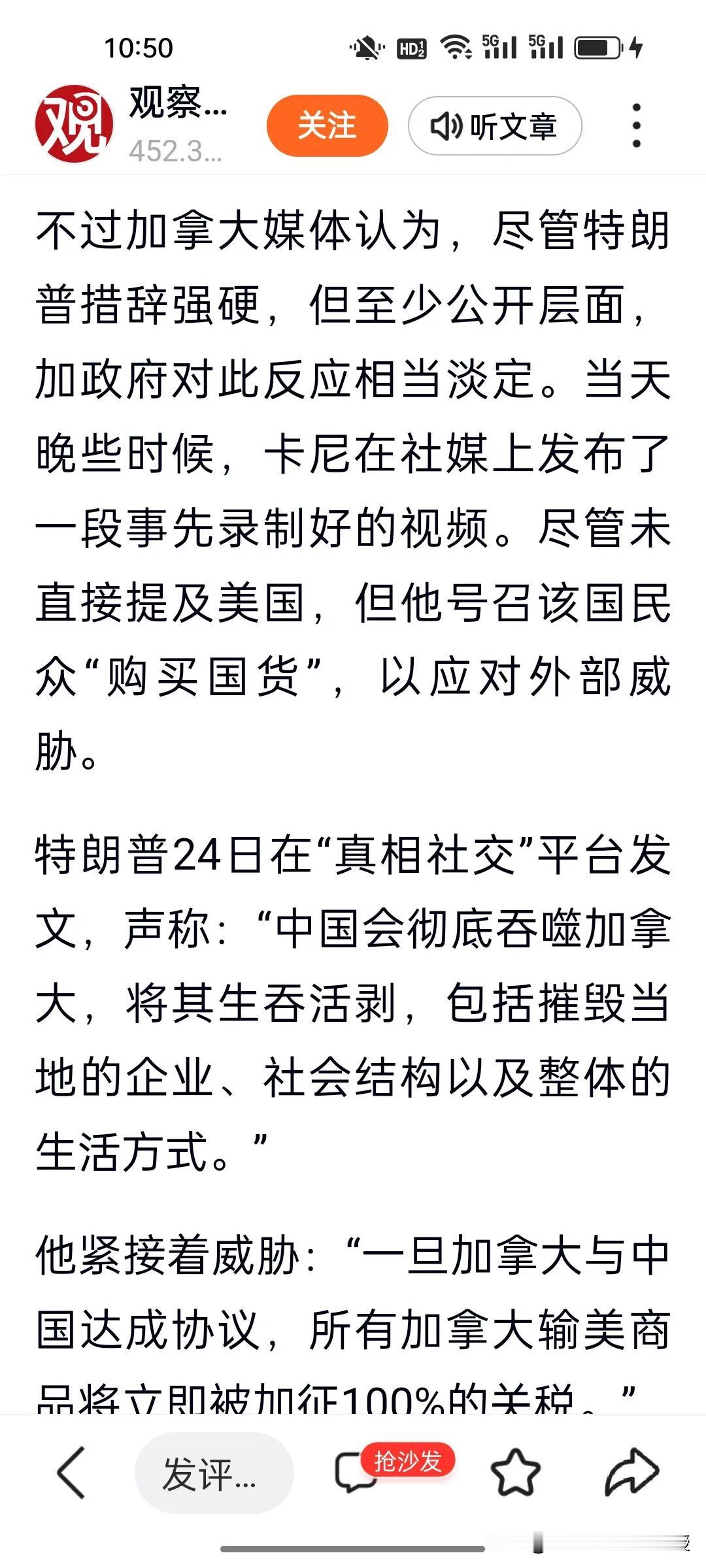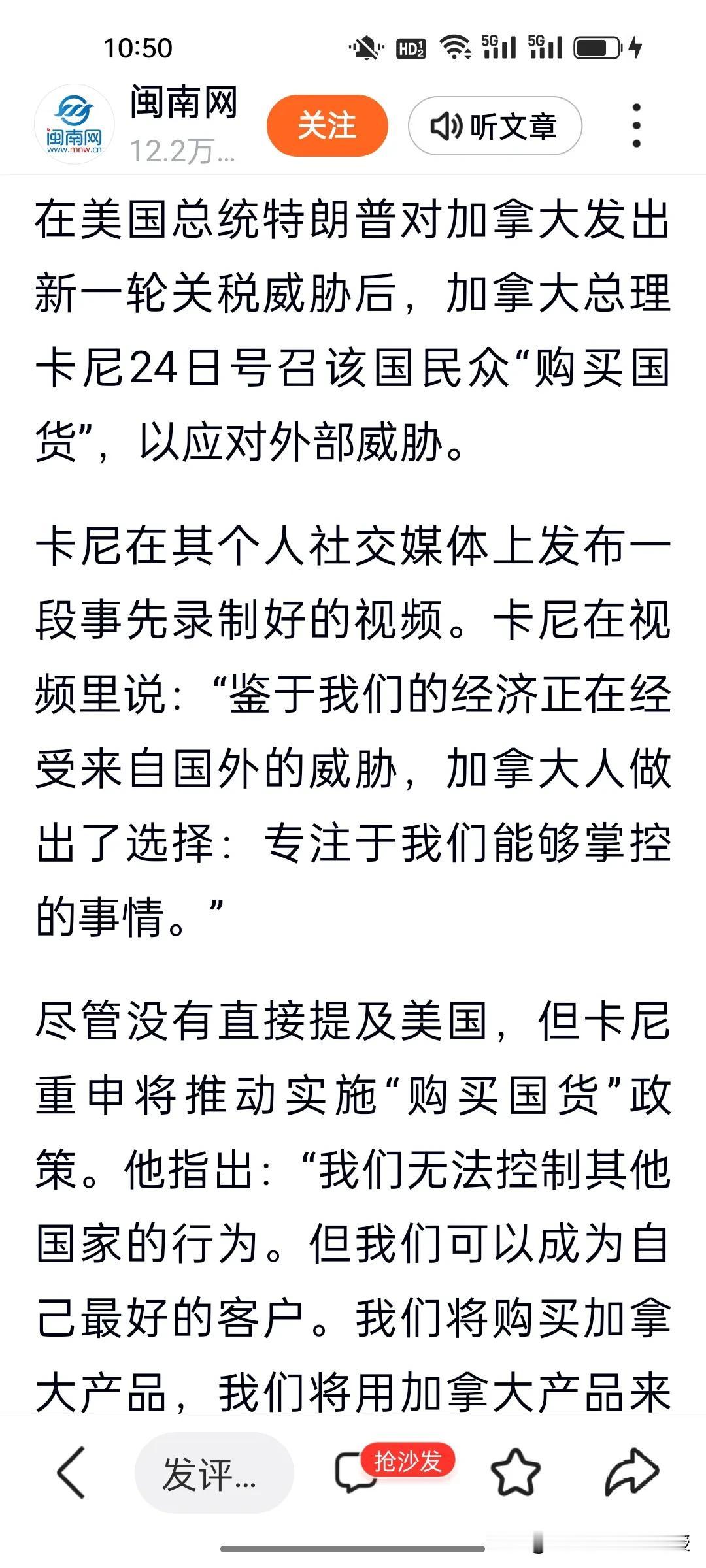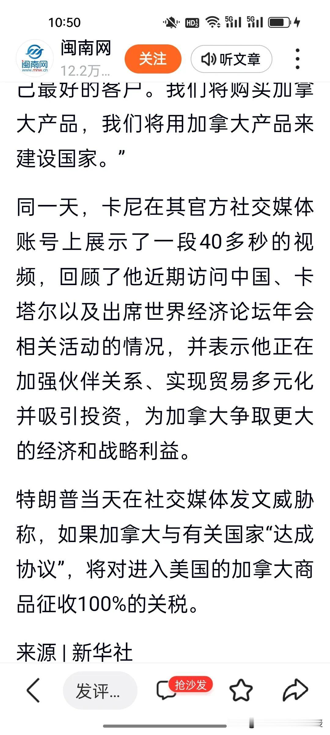 特朗普又双叒叕变卦了!刚刚,特朗普发文说,若加拿大与中国达成贸易协议,将对所有加拿大输美商品加征100%关税。他还称中国会“吞噬”加拿大。在外界看来他还在“善意”提醒加拿大。 可1月16日特朗普曾称加中达成协议是“好事”,今天突然又发这样的消息,态度180度反转。特朗普经常变卦,也只会挥舞关税大棒。面对霸权施压,加拿大态度坚定,卡尼号召国民“购买国货”,各省政界齐声表态拒做他国附庸。 要知道2025年中加贸易互补性凸显,加方取消对华电动车高关税,中方降低其农产品壁垒,本币互换协议更让双边贸易摆脱美元掣肘。 特朗普还想靠关税拴住盟友,这招根本不管用,芬兰总理今天也来华访问四天,各国正在为经济发展自主选择合作,这才是不可逆的时代潮流!