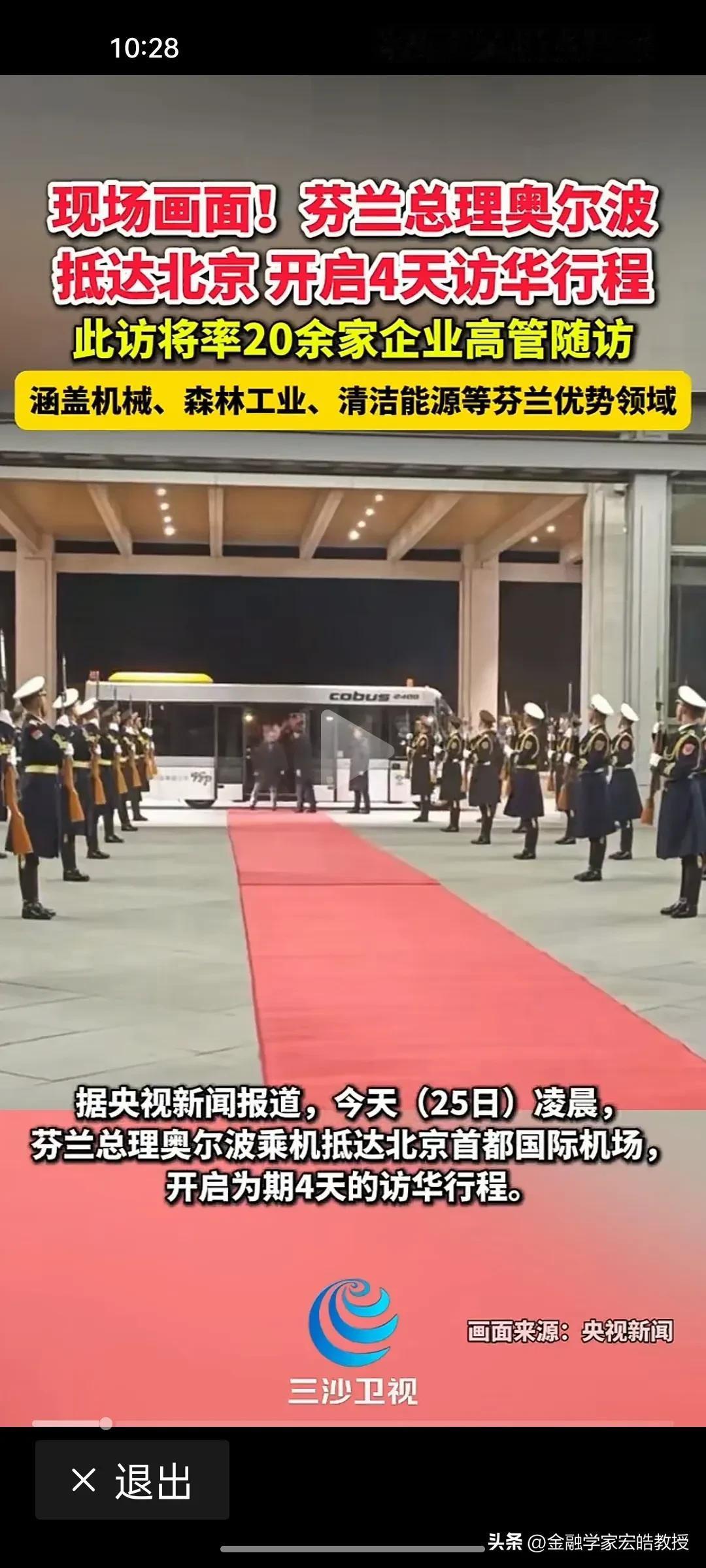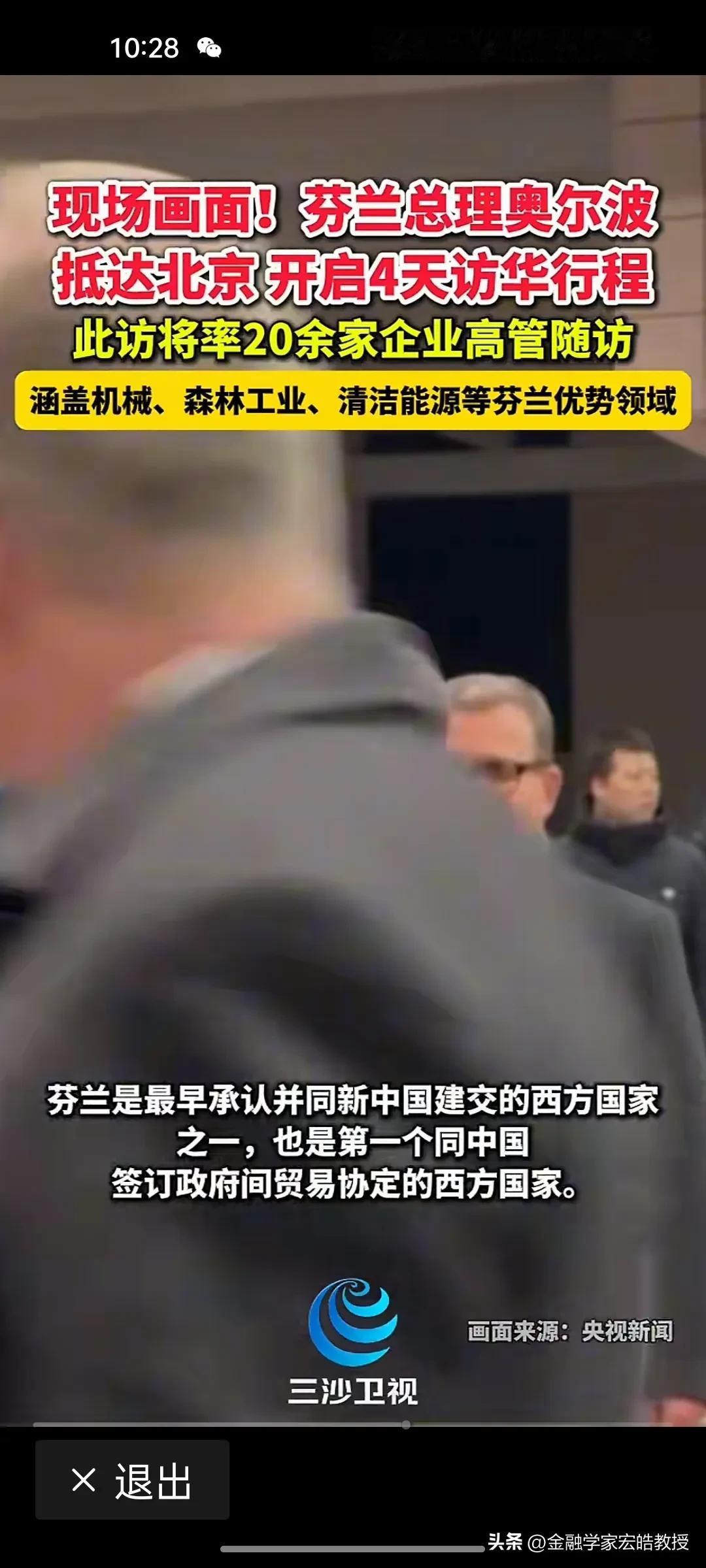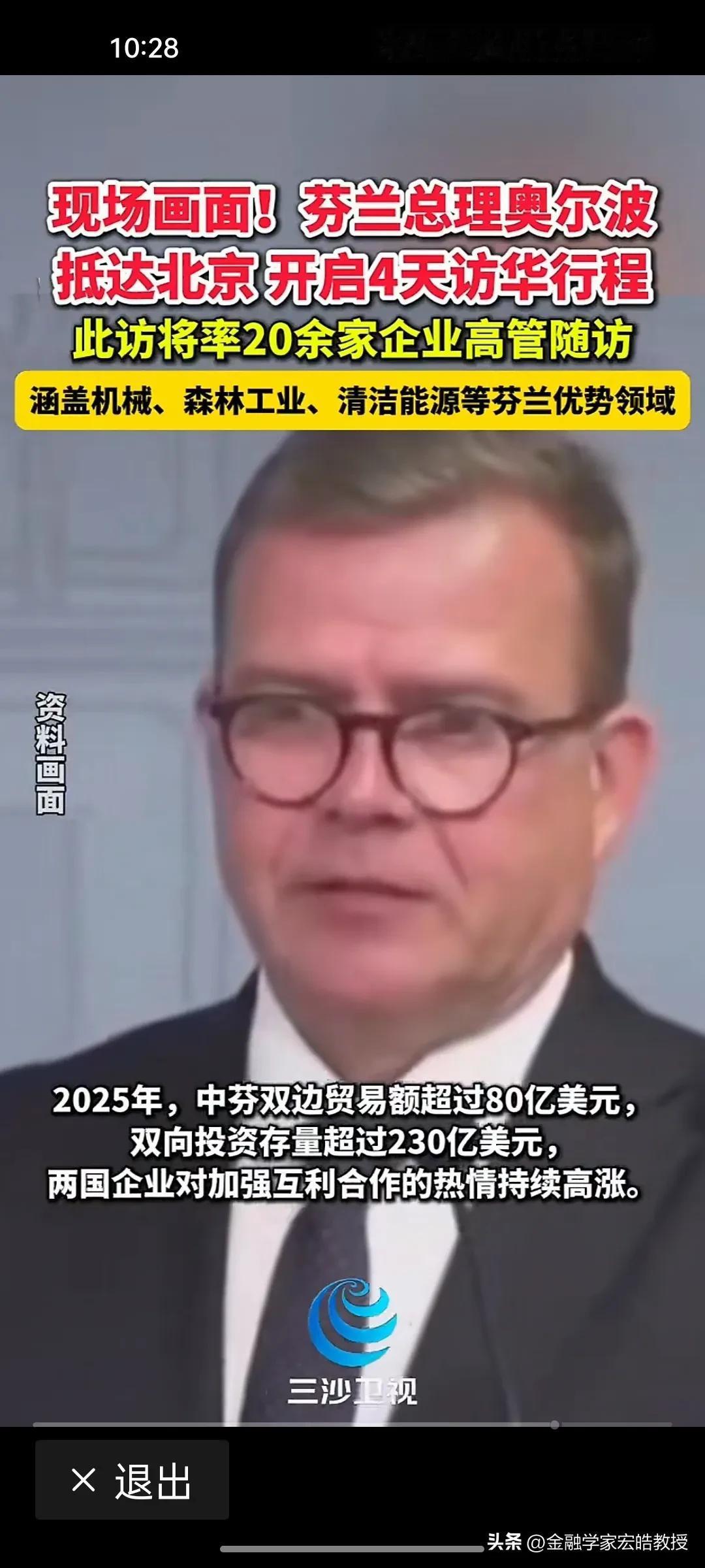 芬兰总理为何此时访华?背后藏着北约国家的集体幡然醒悟! 当加拿大总理带着满满合作成果回国,又在达沃斯公开反思对华关系,芬兰总理奥尔波便紧随其后率20余家企业高管抵京,开启4天访华行程。 在北约阵营中,这股“向东看”的浪潮耐人寻味。一边是美国持续施压要求选边站队,一边是中芬80亿美元贸易额、230亿美元双向投资的现实红利。 芬兰239家在华子公司年营业额超140亿欧元。机械制造对华出口增10%,森工产品稳占出口16.8%。当能源、森林工业等领域的合作能带来实打实的发展,当“安全”不再只靠军事捆绑,这些国家自然要为自己找出路。 在美式霸权的裹挟下,北约国家早已看清:盲从没有出路,唯有主动对接中国,才能守住自身发展的主动权。 从渥太华到赫尔辛基,北约国家早就心照不宣地达成共识,在霸权逻辑下,唯有向东看,互利共赢才是破局的解药。