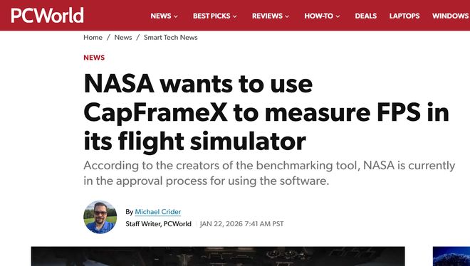 [环球网科技综合报道]1月25日消息,据PCWorld报道,知名PC跑分工具CapFrameX开发团队近日在X平台披露,美国国家航空航天局(NASA)正推进相关软件审批流程,计划采用该工具对飞船驾驶舱模拟器的性能进行评估。值得关注的是,开发团队特别强调,此次合作意向由NASA主动发起,并非开发团队主动接洽。