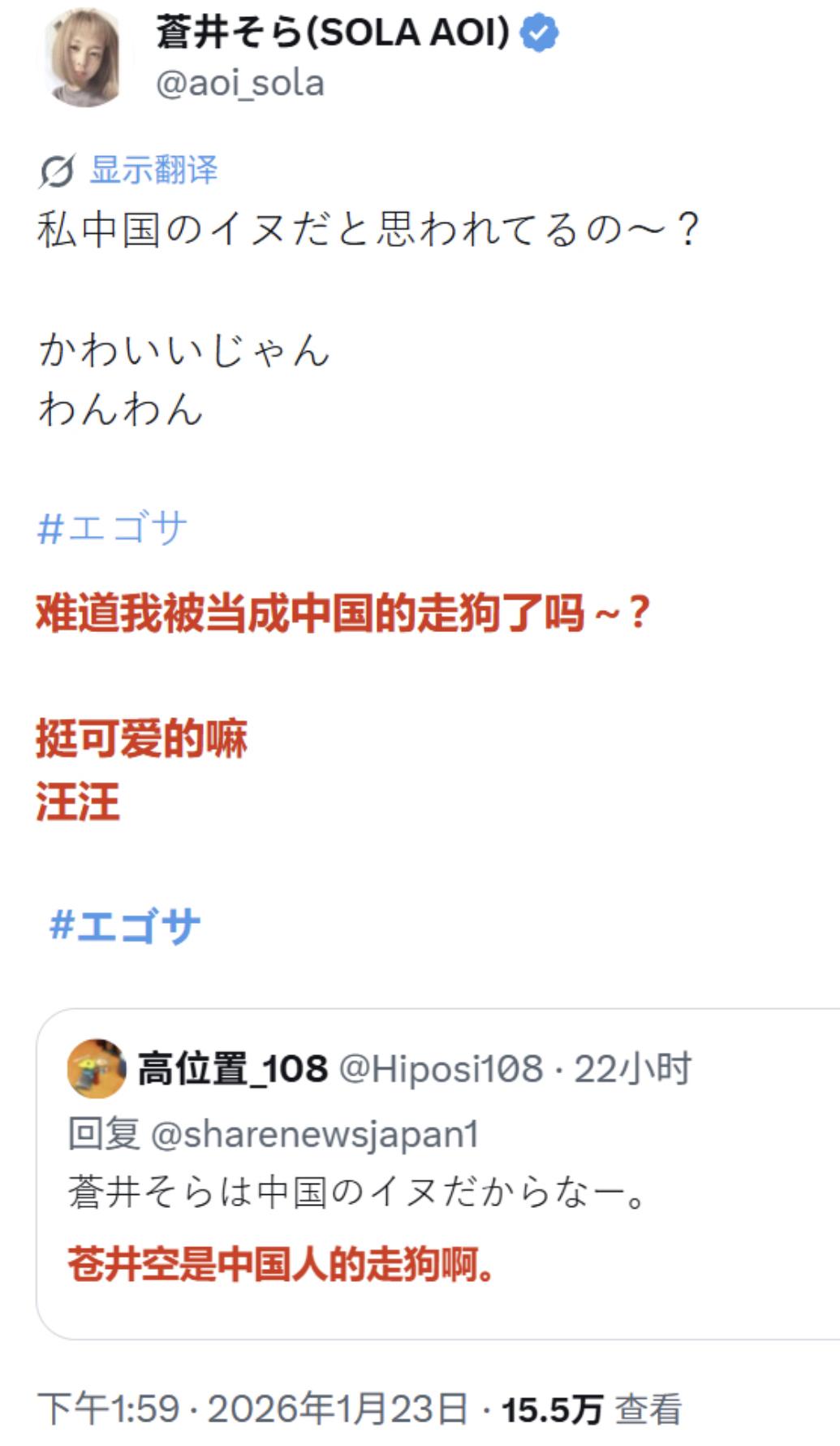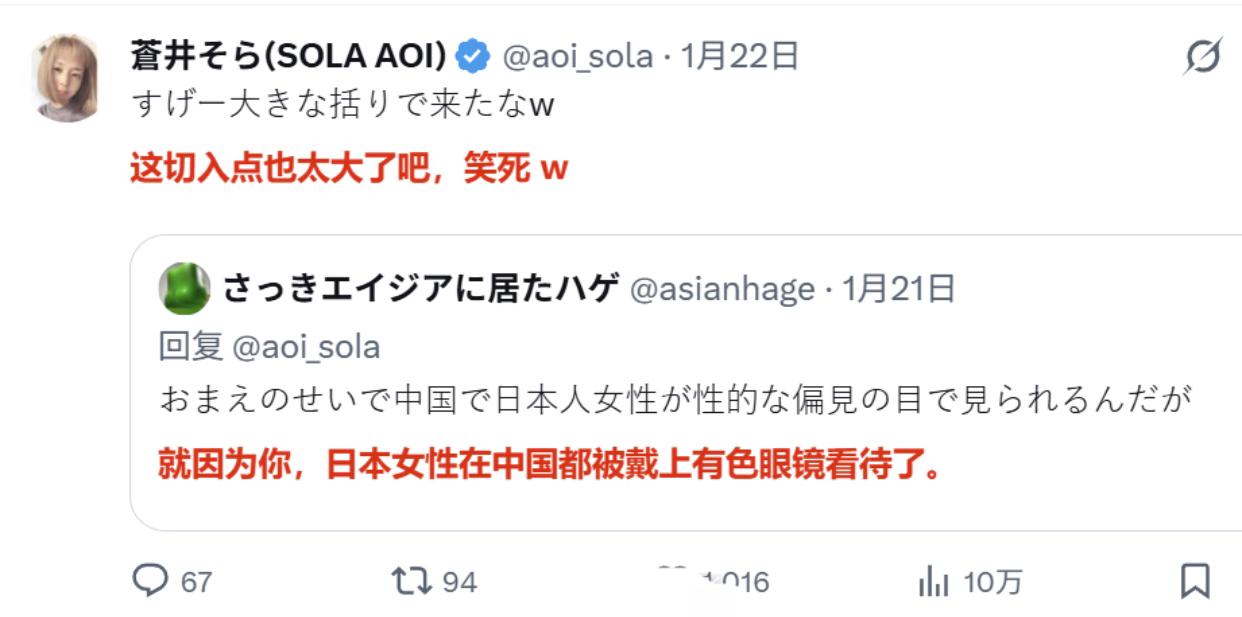 日本知名演员苍井空因为在网上发文称,“喜欢中国”而遭到日本右翼分子的围攻,在其帖子下面就行谩骂、攻击。 有右翼分子指责道,“就因为你,日本女性在中国都被戴上有色眼镜看待了”,还说她“是中国人的走狗”。
