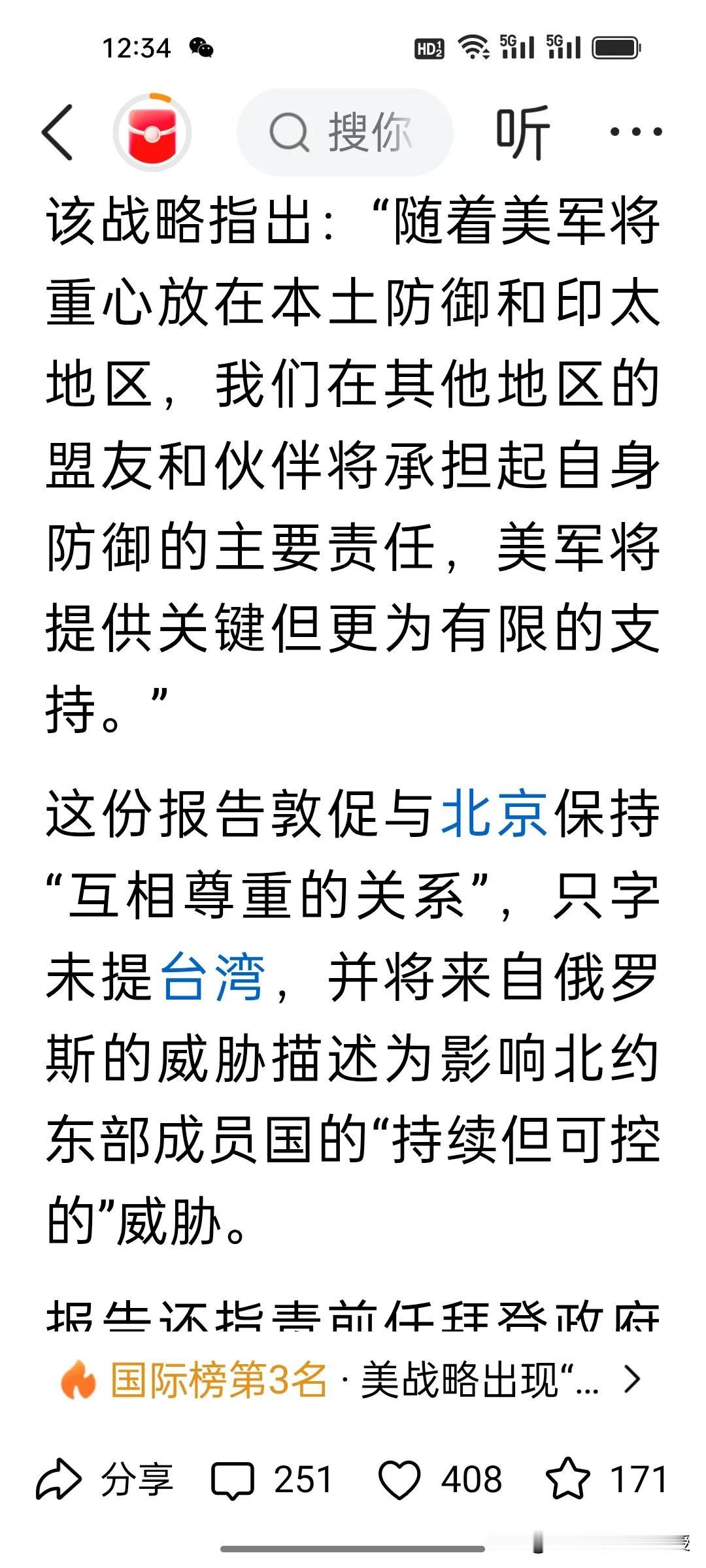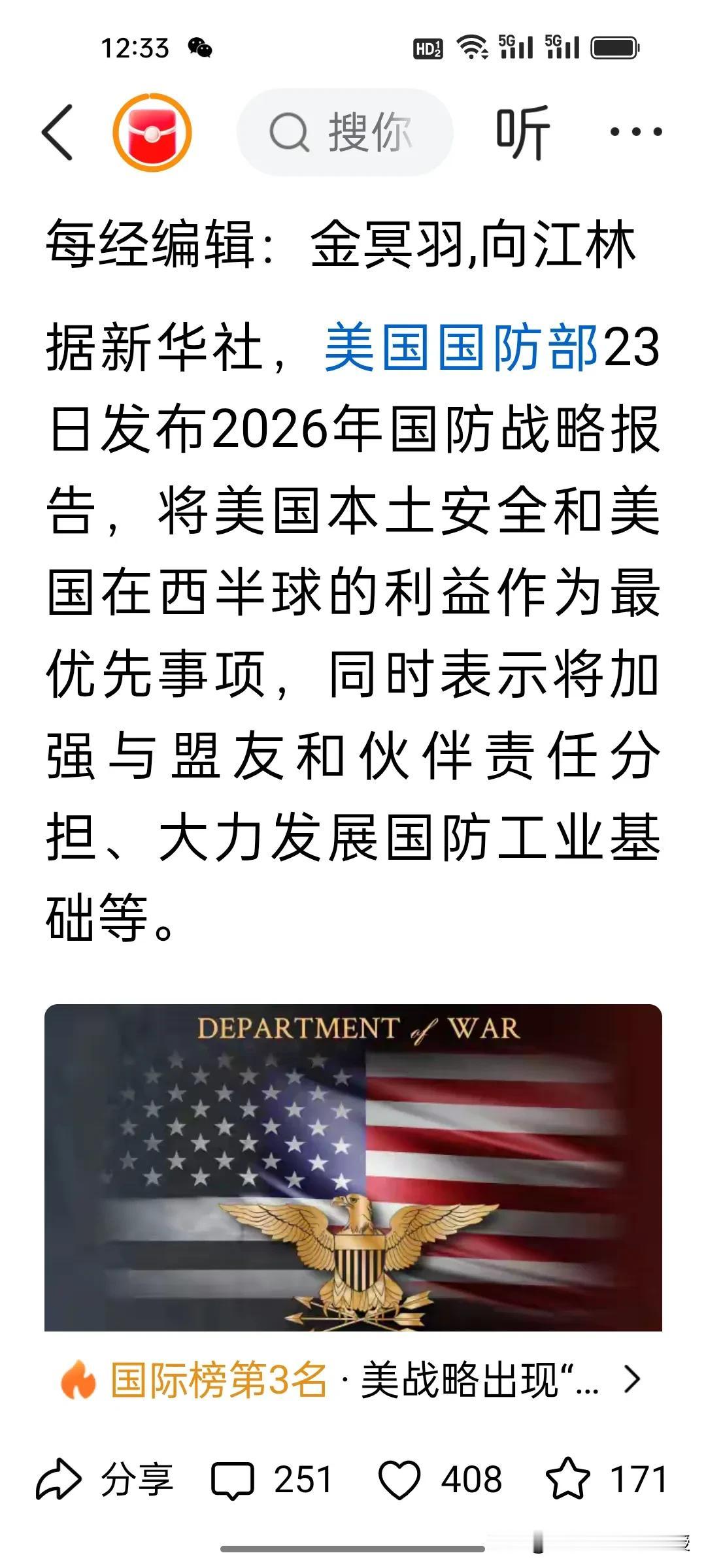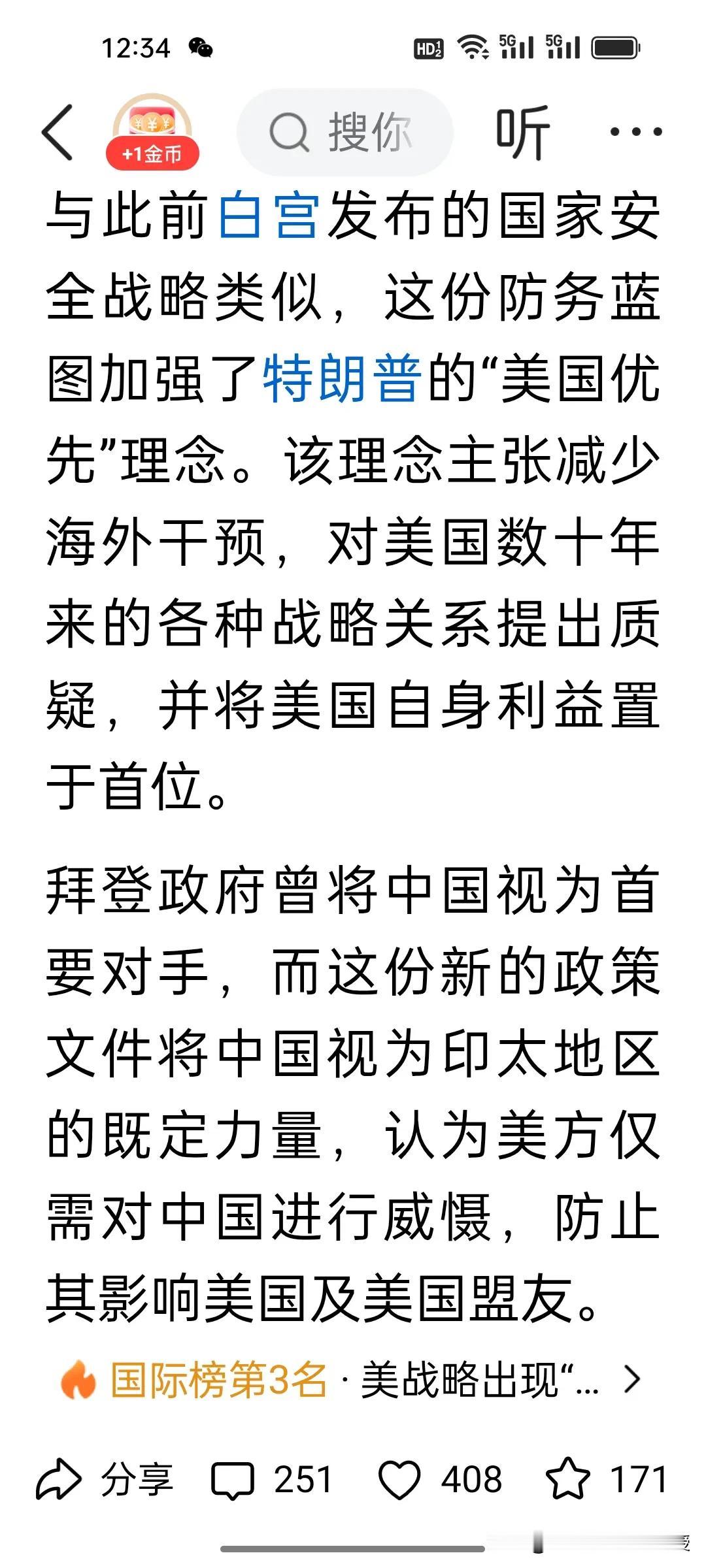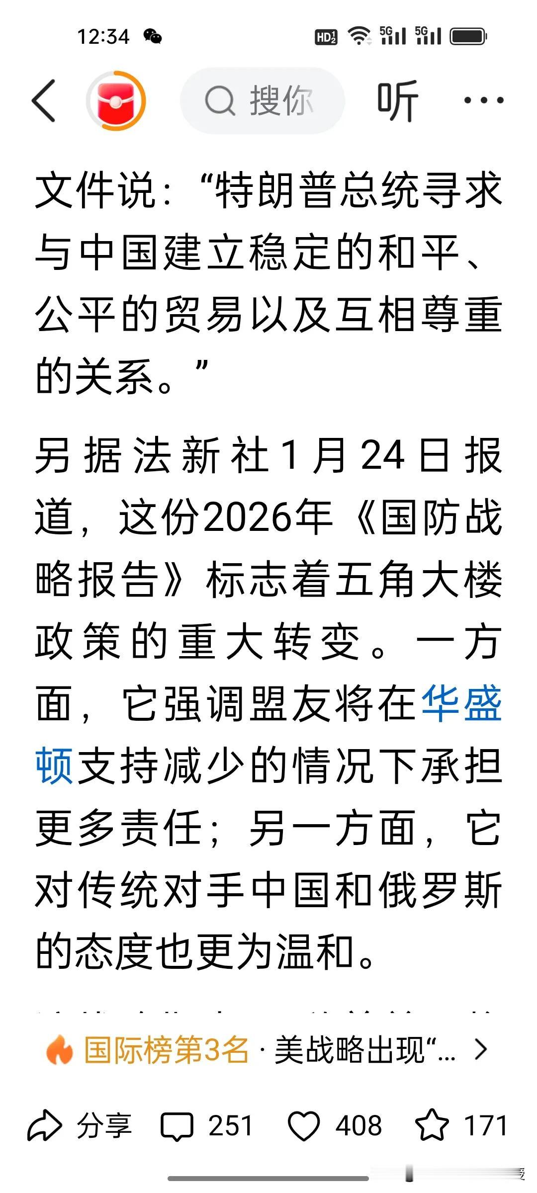 美国对华战略为何突然转向?美国国防部刚刚发布的新版国防战略报告释放关键三大核心信号:视中国为印太既定力量仅作威慑、美军重心回归本土并缩减海外支持、要求盟友扛起自身防务主责。 美方主动缓和对华关系,这与去年白宫发布的国家战略报告如出一辙,本质是现实所迫:中国制造业韧性与新兴产业优势让其无法实现脱钩,国内通胀高企、债务压顶的经济困境难撑长期对抗,同时战略回缩需稳定印太格局。 这份转向绝非真心示好,而是霸权式的权衡与算计。大国博弈的本质是实力较量,这份报告究竟是缓兵之计还是真转舵?你认为这份战略报告能真正缓和中美关系吗?