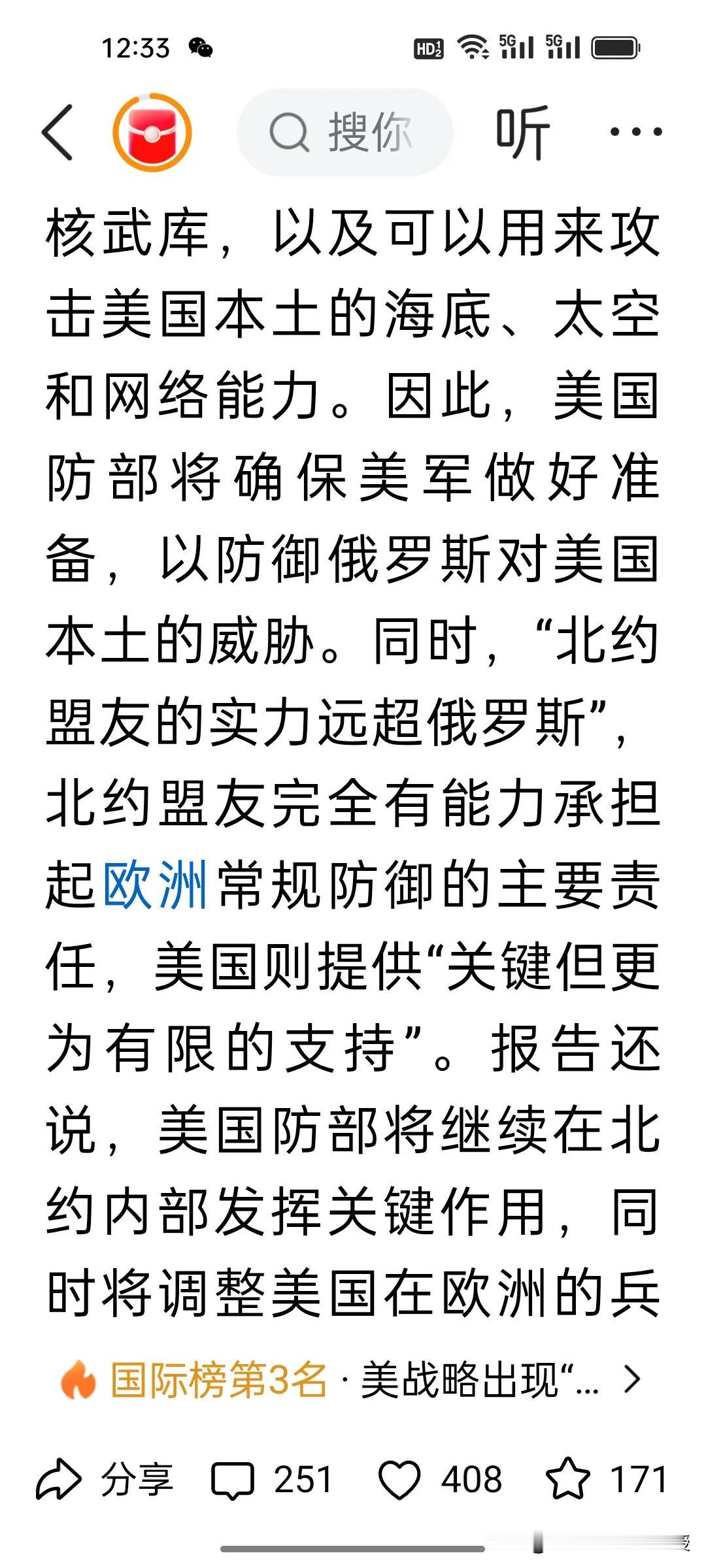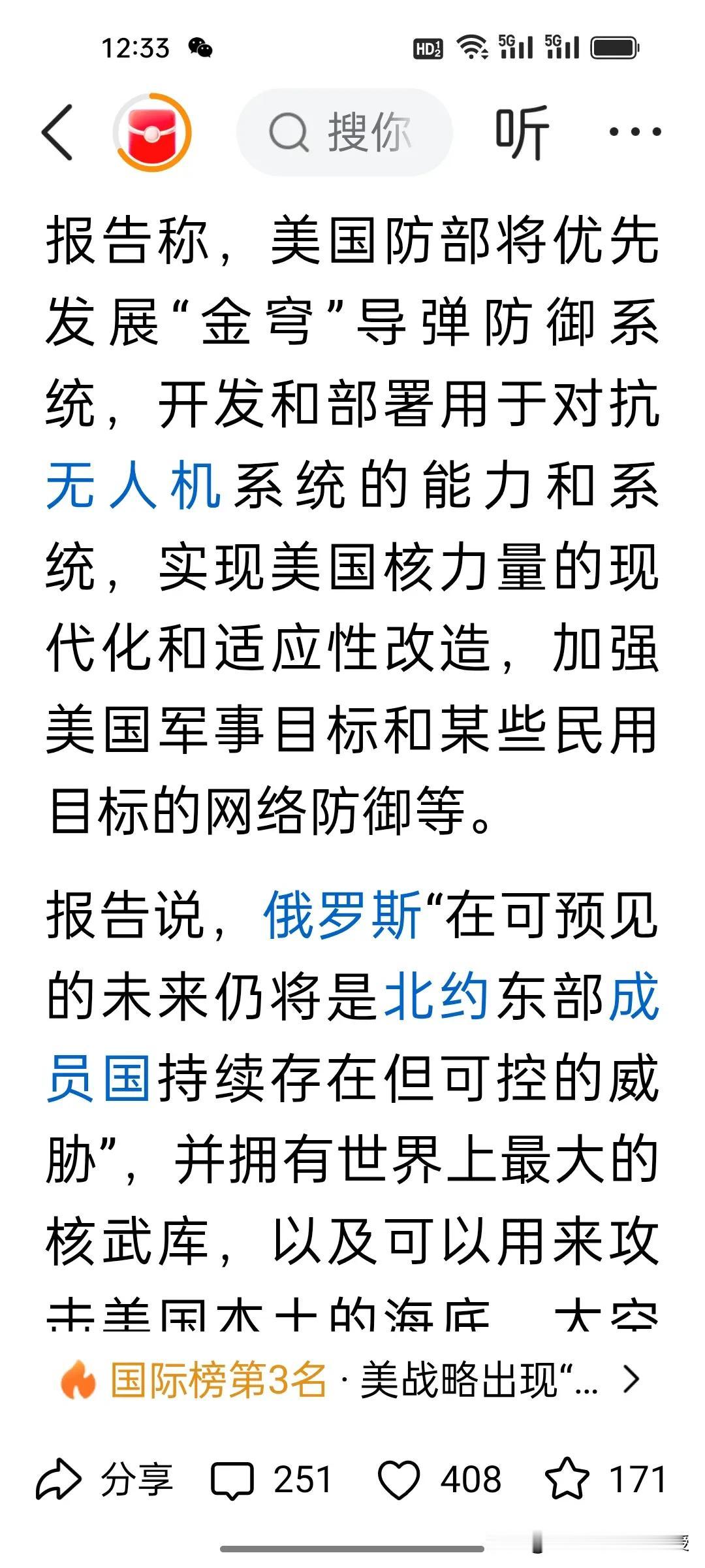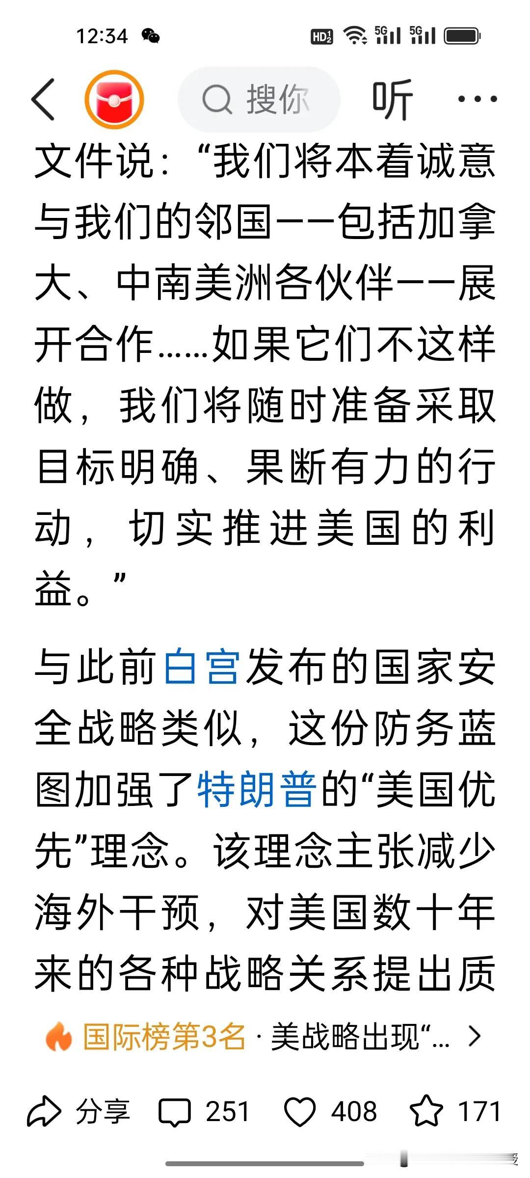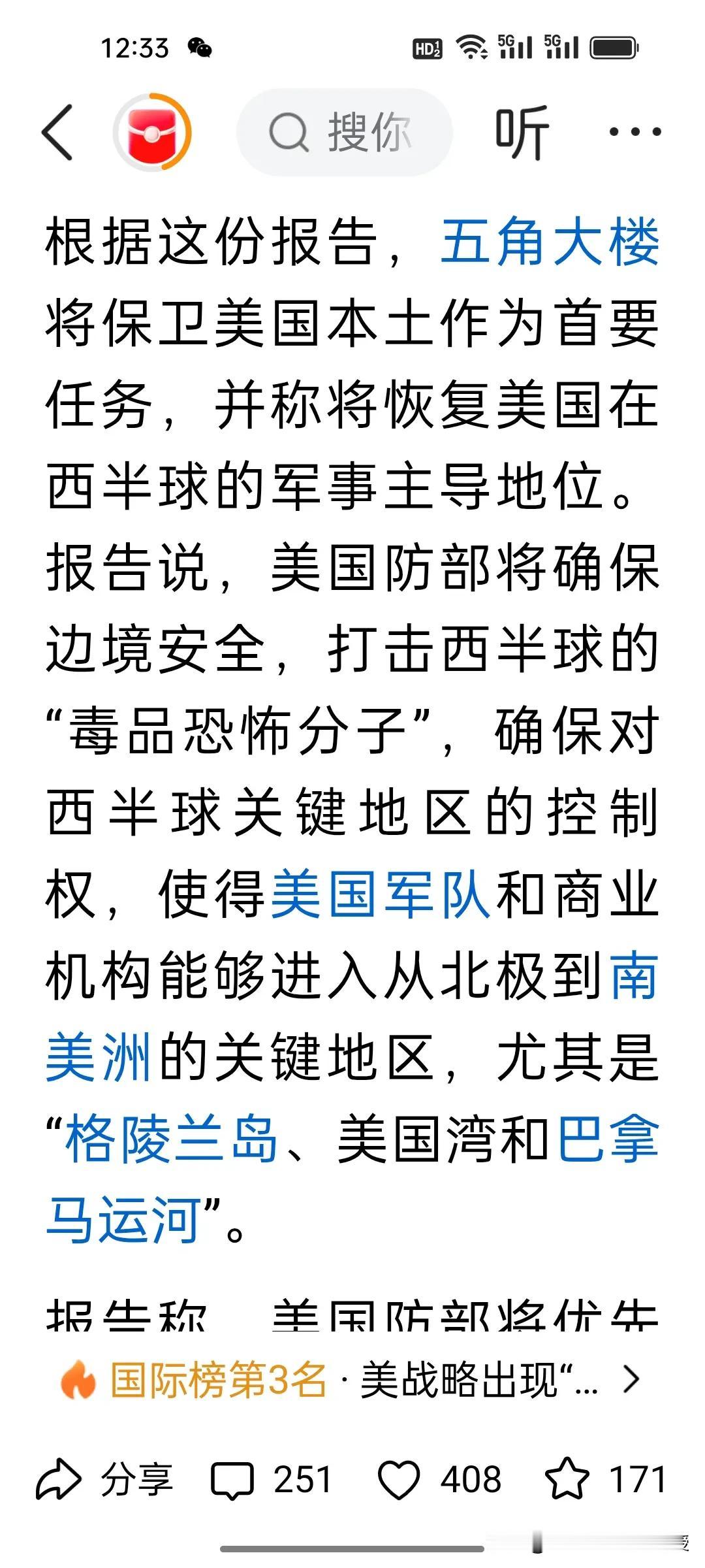 美国对华战略为何突然转向?美国国防部刚刚发布的新版国防战略报告释放关键三大核心信号:视中国为印太既定力量仅作威慑、美军重心回归本土并缩减海外支持、要求盟友扛起自身防务主责。 美方主动缓和对华关系,这与去年白宫发布的国家战略报告如出一辙,本质是现实所迫:中国制造业韧性与新兴产业优势让其无法实现脱钩,国内通胀高企、债务压顶的经济困境难撑长期对抗,同时战略回缩需稳定印太格局。 这份转向绝非真心示好,而是霸权式的权衡与算计。大国博弈的本质是实力较量,这份报告究竟是缓兵之计还是真转舵?你认为这份战略报告能真正缓和中美关系吗?