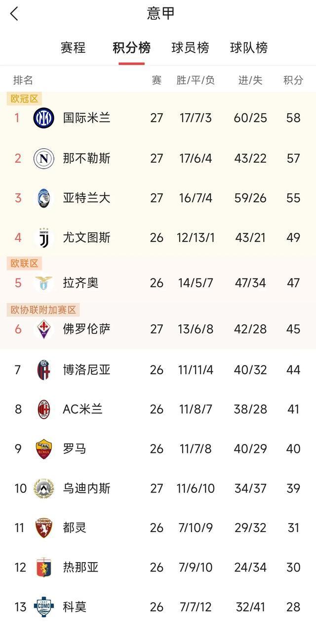 这时候,我想起了网上的一个评论:“国米就像一个永不言败的战士,无论遭遇多少困难,都会勇往直前。”确实如此,国米在这场比赛中展现出了强大的韧性。那现在国米1 - 1扳平那不勒斯,这1分对于国米在联赛中的领跑地位有什么意义呢?咱们来看看国米和其他同级别竞争对手的情况。