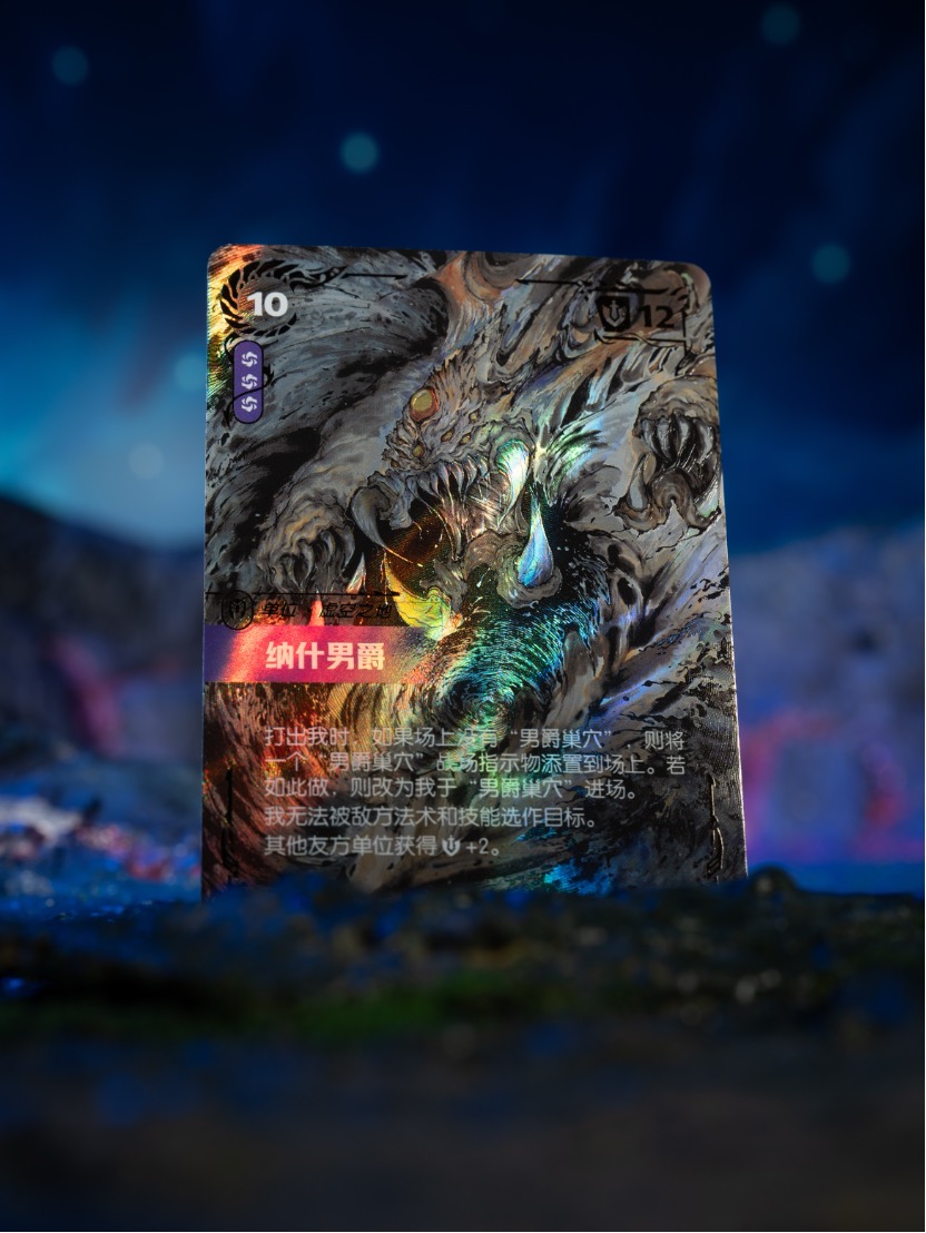 与此同时,本弹最受关注的收藏向卡牌之一,是由当代水墨青年艺术家张渔绘制的【终极超编纳什男爵】。