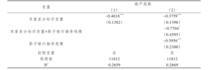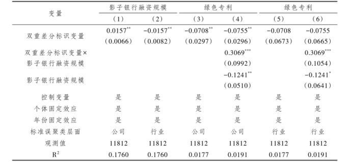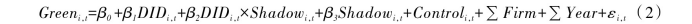 文章还构建了模型(2)来检验假说H2:重污染企业影子银行融资规模是否强化了绿色信贷政策倒逼其进行绿色转型的政策效果。