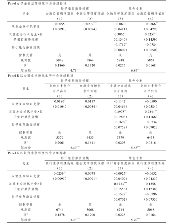 本文预期在影子银行活跃度较高的地区,当地的重污染企业才有条件借助影子银行来帮助其更好地实现绿色创新。第一,考虑到影子银行活跃度和金融监管环境密切相关,即在金融监管强度更高的地区,影子银行将受到更大程度的限制,采用“区域金融监管支出/金融业增加值”来衡量各个省份的金融监管强度,并以此作为第一个分组标准。根据企业所在省份在2011年的金融监管强度是否高于所有样本省份在2011年的金融监管强度均值,将样本企业分为金融监管强度高组和金融监管强度低组。第二,考虑到影子银行活跃度和金融业市场化水平息息相关,即在金融业市场化水平更高的地区,影子银行将拥有更大的发展空间,本文采用樊纲指数中金融业市场化水平这一子指标作为第二个分组标准。根据企业所在省份在2011年的金融业市场化水平是否高于所有省份在2011年的均值,将样本企业分为金融业市场化水平高组和低组。基于相同的逻辑,又采用银行业的赫芬达尔指数来衡量各个省份的银行竞争程度,以此作为第三个分组标准。根据企业所在省份在2011年的银行竞争程度是否高于所有省份在2011年的均值,将样本企业分为银行竞争程度高组和低组。表3的所有结果均与本文的理论预期一致。