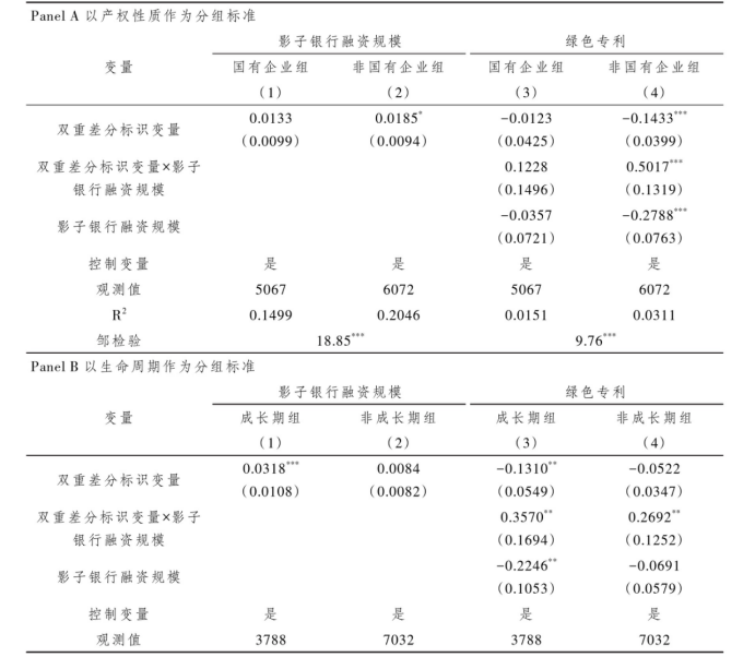 由前文可知,重污染企业之所以转向影子银行进行融资,其背后的原因在于绿色信贷政策使得重污染企业融资更为困难,产生了资金缺口。如果重污染企业在绿色信贷政策出台以后并未面临严峻的资金困境,其自然也就不会选择影子银行这一替代性融资渠道。按照以下分组标准进行了分组检验:(1)根据产权性质将样本分为国有企业、非国有企业两组。相比国有企业,由于非国有企业多数不具备和政府讨价还价的能力,其面临的环境监管也更为严苛,绿色信贷政策的融资惩罚效应在非国有企业中可能会更为突出。(2)基于销售收入增长率、留存收益率、资本支出率、公司年龄四个变量的综合得分来识别企业所处的生命周期,并根据2011年是否处于成长期将样本企业分为成长期、非成长期两组。处于成长期的企业融资难度更高。表4的结果均与本文的理论预期一致。