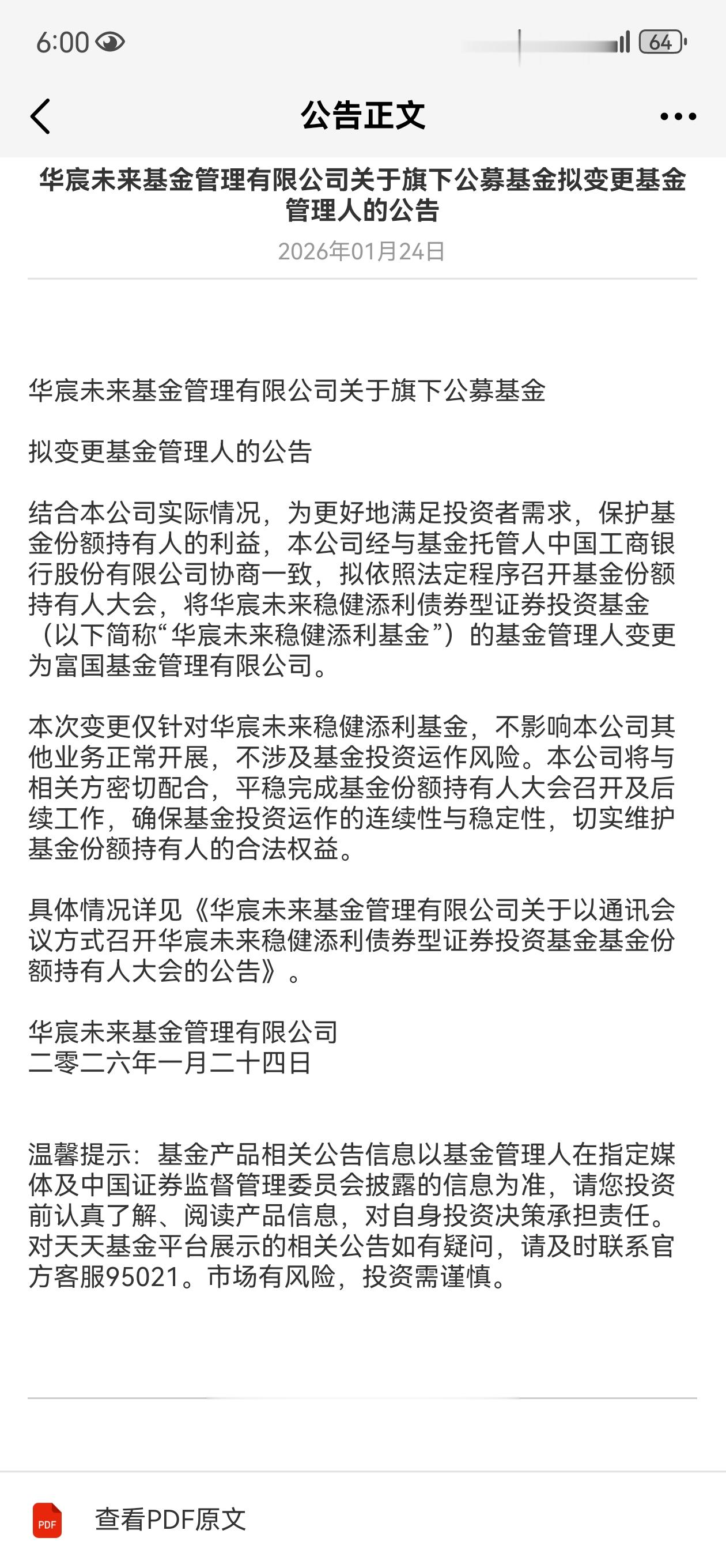 上证报中国证券网讯(记者朱妍)1月24日,华宸未来基金发布公告称,为更好地满足投资者需求,保护基金份额持有人的利益,该公司经与基金托管人中国工商银行股份有限公司协商一致,拟依照法定程序召开基金份额持有人大会,将华宸未来稳健添利的基金管理人变更为富国基金。同时,该公司表示,此次变更仅针对华宸未来稳健添利,不影响该公司其他业务的正常开展。