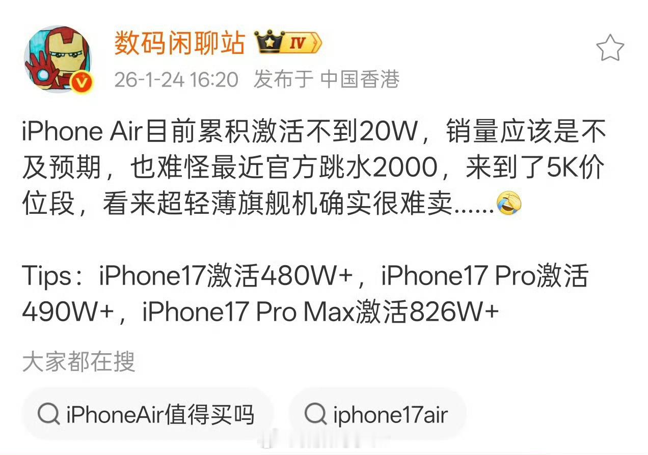 曝iPhoneAir累积激活不到20万台产品牺牲太大价格又贵激活量能多才怪呢要是早点降价,再加上国补的话,也不至于混成这样