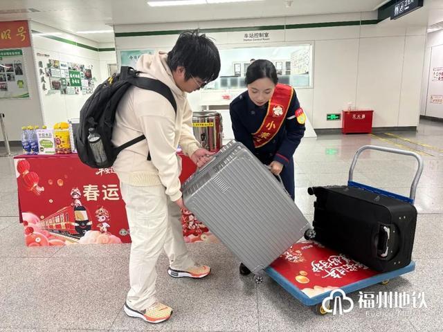 为缓解返乡学子携带大件行李出行不便难题,福州地铁在上述站点设立“春运服务台”,聚焦学子出行需求,提供行李搬运、出行问询等便民服务。车站工作人员将协助学子整理零散物品,借助小推车高效搬运行李,护送有需要的学子从车站出入口直达站台候车区域。