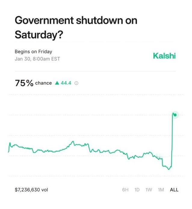 据Kalshi预测市场称,美国政府停摆的可能性飙升至75%。