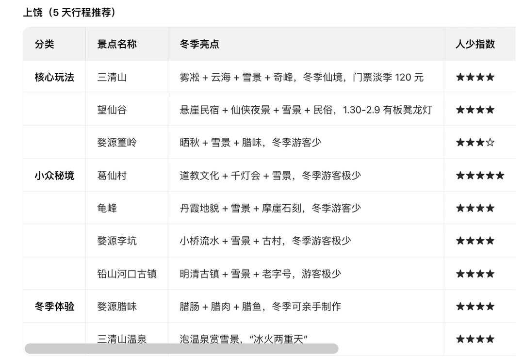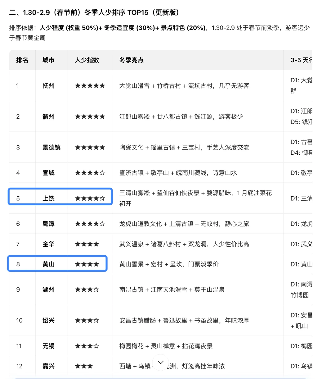今天已经到苏州了 小年之前要回趟江西老家祭祖 然后再到苏州过年 在1月底-2月中上旬,会从苏州自驾去九江 大概就是图1这一圈 路上选两三个市玩半个月 初步计划重点在黄山市,上饶市 (黄山,宏村等;望仙谷,三清山,婺源等) 不知道这个安排是否如何? 春节前人应该不多吧? 但看天气还有下雨 作为一位南方人,但对南方还不太熟(图2是Ai给的,感觉没那么靠谱) 求点建议[萌萌哒R]