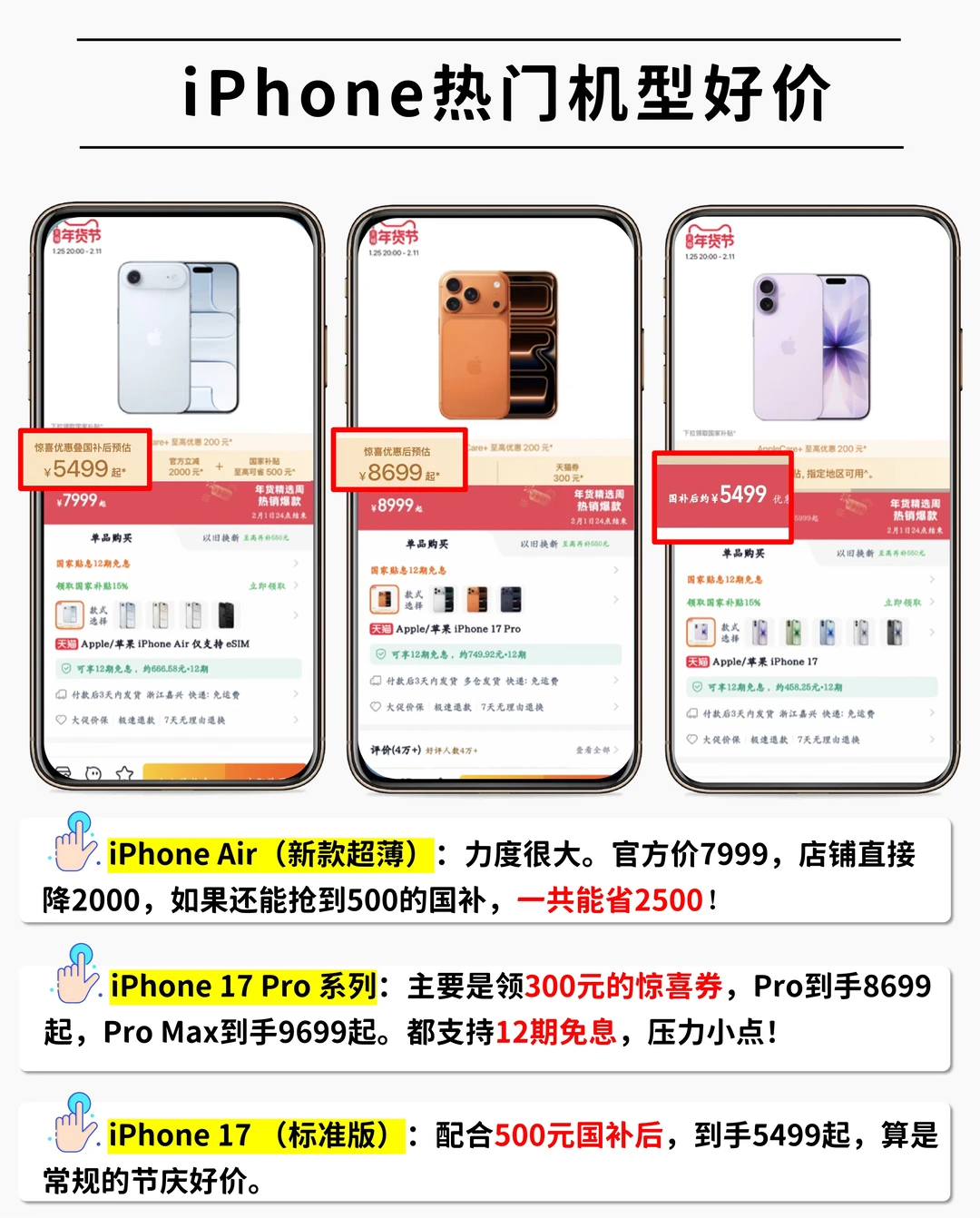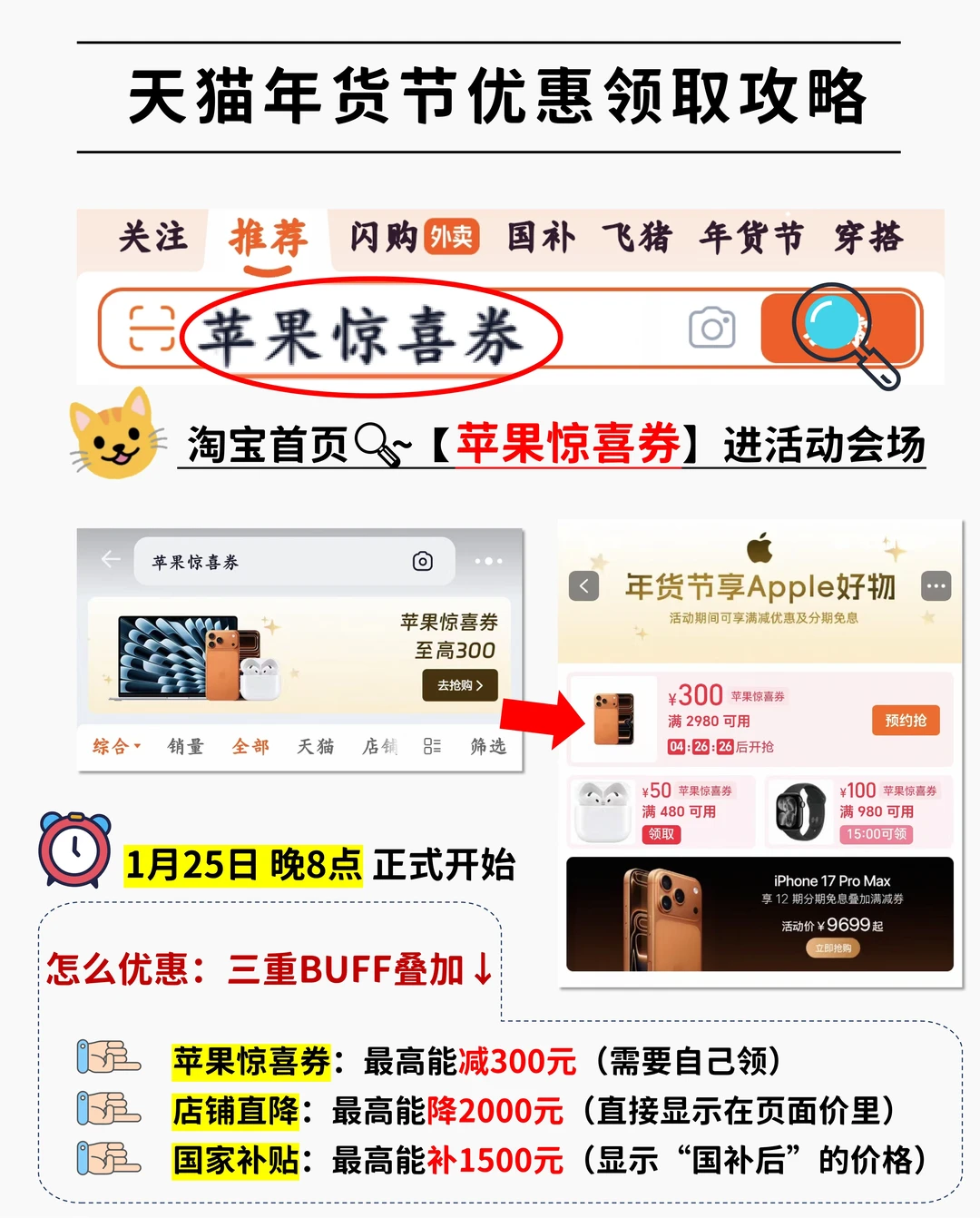 宝子们,年前想换苹果设备的,可以不用等啦!天猫苹果官方旗舰店的年货节优惠详情出来了,我仔细看了下,这次主要是三重优惠叠加,一些新品的价格确实比双11之后要香一些。给你们整理了个省流版,一看就懂↓ 📢活动核心信息: 🔹 时间:1月25日 晚上8点 正式开卖 🔹 地点:淘宝首页🔍【苹果惊喜券】就能进去会场 图上可以看到,这次不只是 📱iPhone,包括⌚手表、🎧耳机、💻平板和电脑在内,很多热门产品都参与优惠。不过不同产品的优惠构成不太一样,我来分分类: 1️⃣第一类:iPhone Air,属于“大额店铺直降+国补”的典型。 像256G的iPhone Air,店铺直接降了2000,再加上国补500,总共2500。这个组合下来,到手价5499,比起官方指导价7999,差价确实很明显。这类优惠比较直接,价格基本上就是最低了。 2️⃣第二类:iPhone 17 Pro系列,主要是“惊喜券”。 Pro和Pro Max都能用300的惊喜券,需要注意一下,这个券需要自己领哦。 3️⃣第三类:iPhone 17这类,属于“国补”。 国补500后是5499起,和指导价比降了500,操作上相对简单,只要国补名额有,价格就能锁住。 4️⃣第四类:手表、耳机、平板等配件,玩法是“店铺降+惊喜券+国补”灵活组合。 比如💻iPad mini,店铺降550,还能叠加100惊喜券和国补(国补后到手2849)。Apple Watch S11、AirPods 4也类似,都是多重优惠叠加。这类产品如果有换新需求,可以重点算算。 ✨总的来说,这是苹果新品发布以来,天猫官方渠道比较大的一次活动了。如果你刚好有换机计划,或者之前一直在观望,📅1.25号晚上8点可以上去看看!