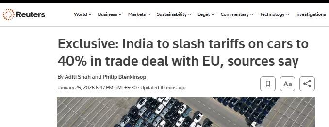最新消息: 🇮🇳🇪🇺印度-欧盟达成贸易协议,汽车关税削减 关税变更 • 从 110% →到 40% • 后来进一步减少至10% 主要优势:- 1. 更低的汽车价格 • 欧洲汽车在印度的价格变得更便宜 • 为消费者提供更多选择 2. 技术转让 • 欧盟在电动汽车、混合动力汽车、安全性和排放方面的先进技术 • 印度加快绿色和电动汽车转型 3. 促进印度制造 • 欧盟公司可能在印度进行生产/组装 • 创造就业机会和供应链增长 4. 印度出口增长 • 改善印度汽车零部件、制药、纺织品和信息技术产品进入欧盟市场的渠道。 • 贸易平衡改善 5. 良性竞争 • 迫使印度汽车制造商提高质量和创新能力 • 长期消费者利益 6. 外国投资增加 • 来自欧盟的外国直接投资增加 • 制造业、清洁能源、物流业的增长 7. 战略优势 • 加强印度与欧盟的伙伴关系 • 降低对任何单一贸易集团的依赖 8. 长期稳定性 • 可预测的关税有助于企业进行规划 • 支持工业持续扩张 摘要:- • 消费者获得可负担性 • 行业获得技术和资本 • 印度获得就业机会、出口和战略优势 印度正在与欧盟达成贸易协议,而加拿大正在与中国达成贸易协议。 全球贸易格局正在发生变化。